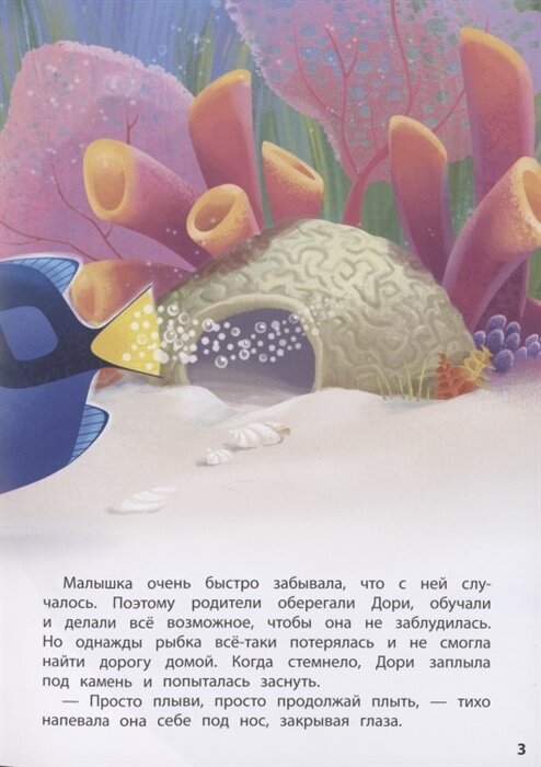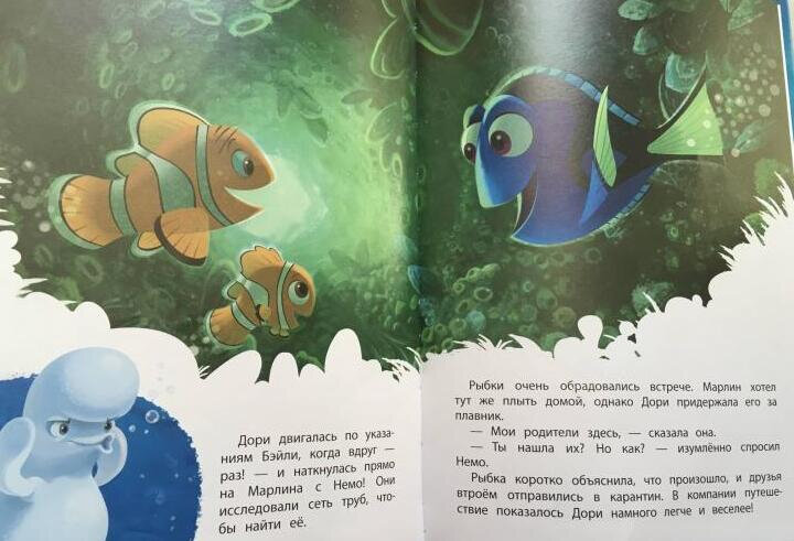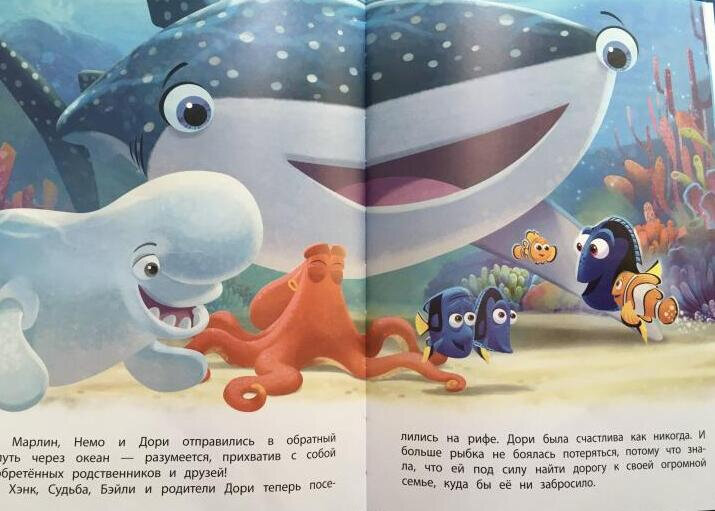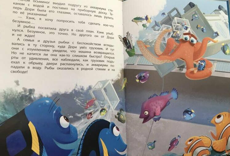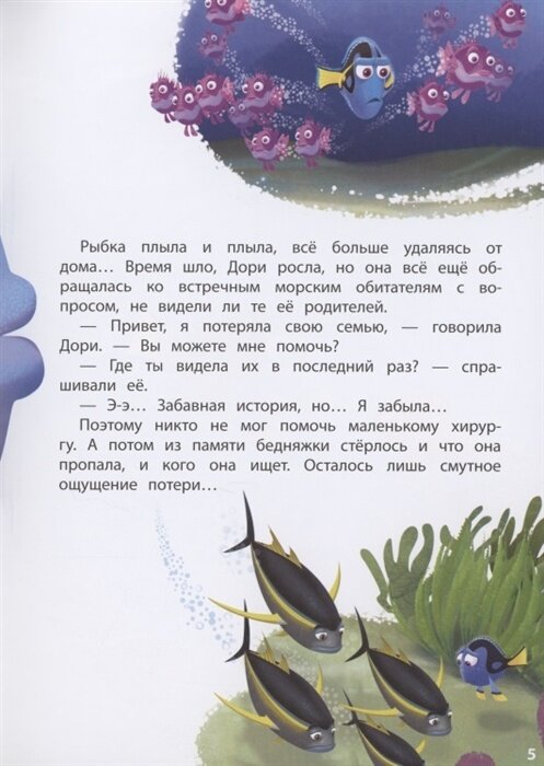 Купила для сына-любителя морской тематики. Картинки очень яркие, живые, выигрышно смотрятся на мелованной бумаге. Что касается текста - с одной стороны он простой, с другой - есть странные обороты (Ведомая этими внезапными просветлениями, Дори быстро поплыла). Это не повествование, а скорее пересказ с очень быстрой сменой событий. Но мальчику 6и лет понравилось, потому что там любимые рыбки
