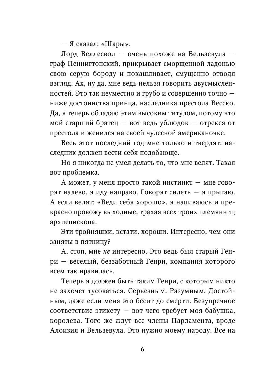 В первых главах Эмма Чейз показывает нам, читателям, как изменилась жизнь главного героя после того, как его старший брат отказался от короны в пользу любви. Теперь жизнь Генри больше похожа на ад: вечные встречи с парламентаристами, скучные игры в гольф, чтение меморандумов, получение новых знаний. Принца никогда не готовили к тому, что он когда-нибудь станет монархом, поэтому ему придется многое наверстать за короткий промежуток времени. Игривый, неунывающий, легкий на подъем Генри никак не может смириться с этой участью. Он не готов к таким резким переменам, но тем не менее, глубоко внутри, он не хочет подвести ни своего брата, ни свою бабушку-королеву, ни свой народ. Ведь его правление останется в истории навечно, и он хочет быть достойный правителем своей страны. Но как же возвратить те старые добрые времена, когда можно было творить что угодно и при этом относительно сухим выходить из воды? Правильно! Согласиться на авантюру!
