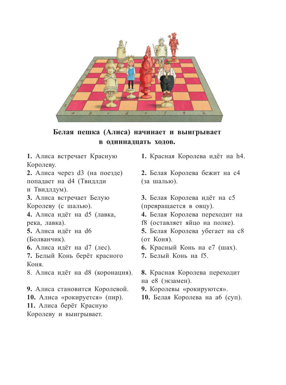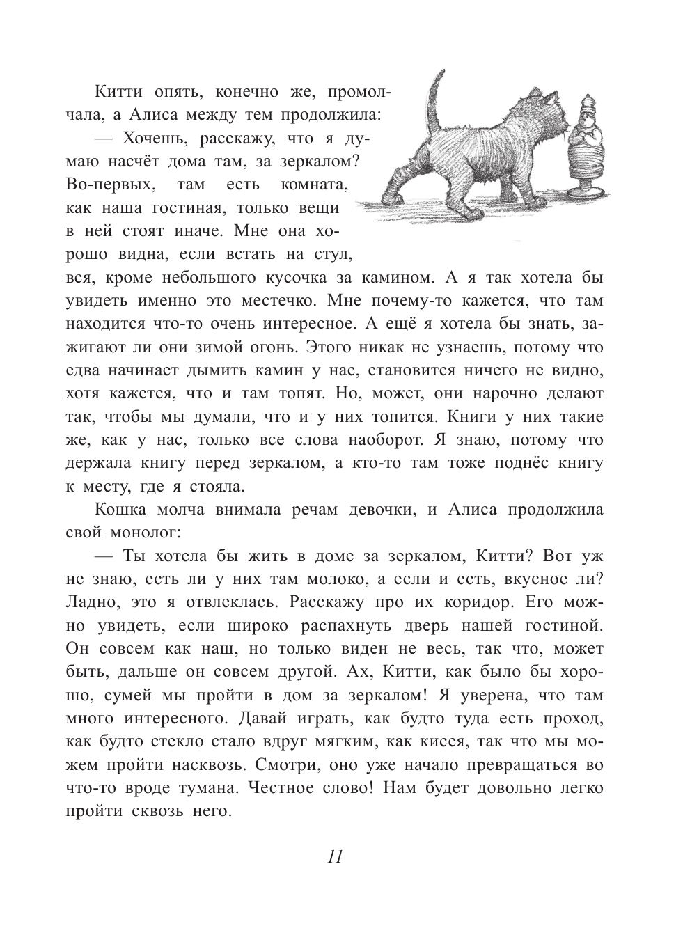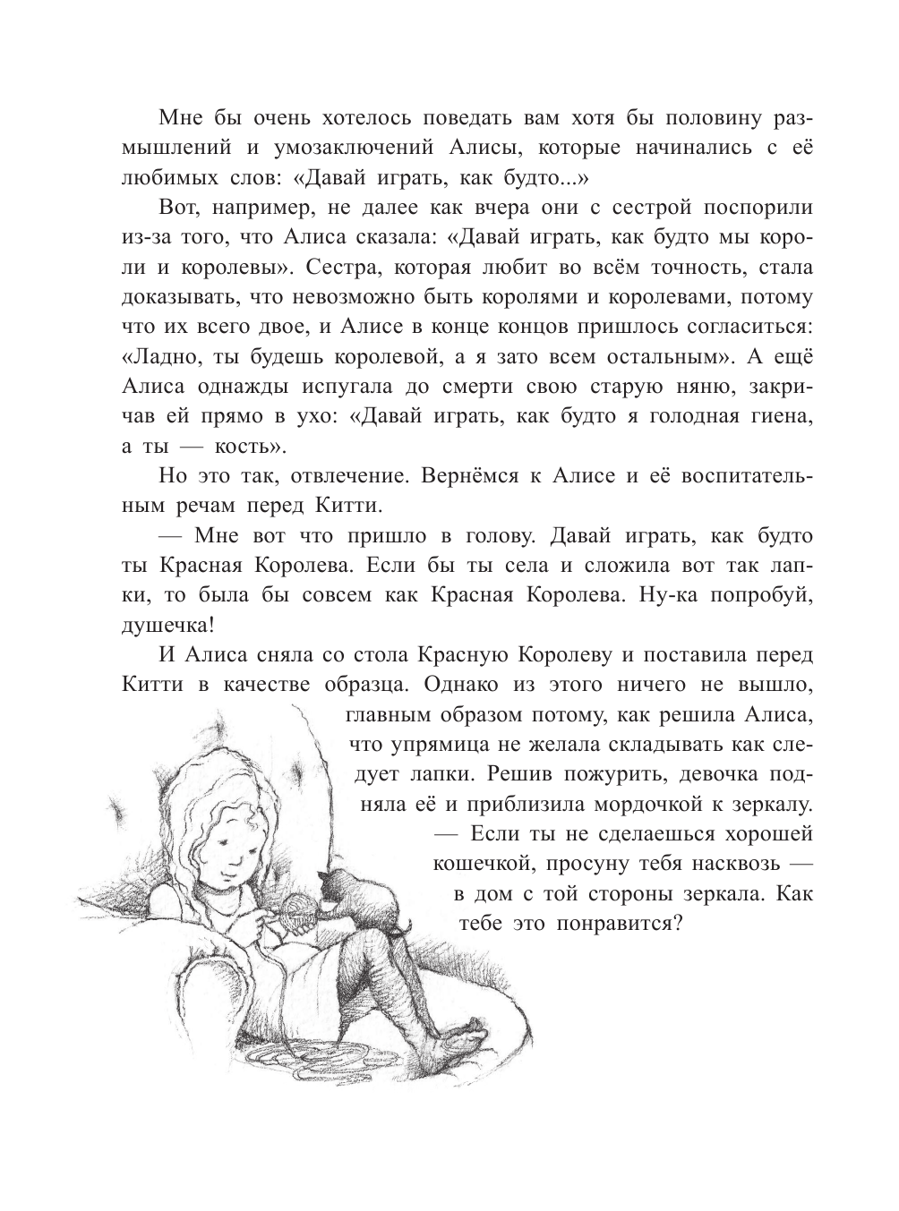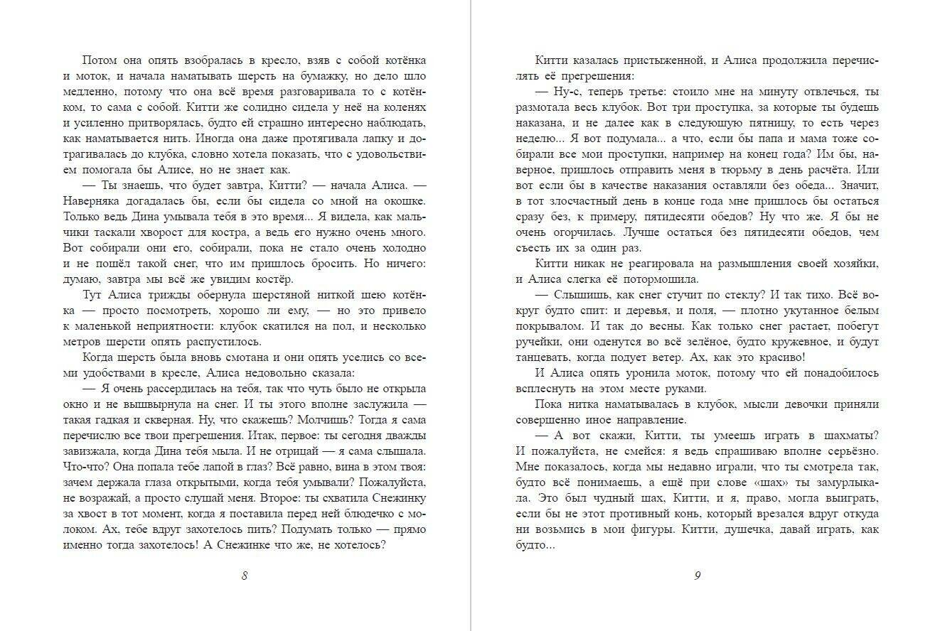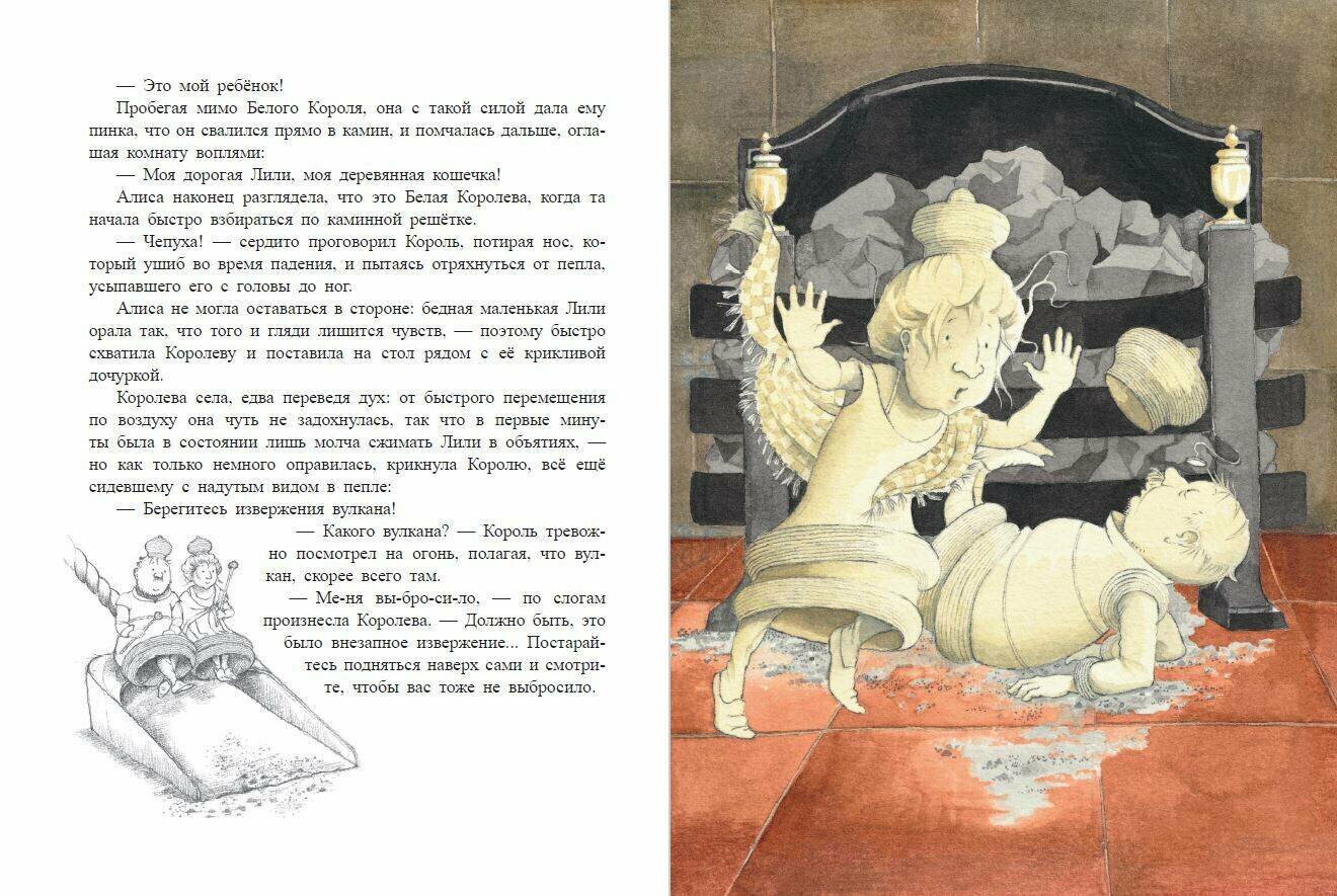 На счет данного перевода могу сказать, что он вполне совместим с рисунками, довольно приятный, игра слов присутствует, но у некоторых персонажей непривычные имена, да и стихи могут отличаться кардинально. Здесь нет черной королевы, а, например, Шалтай-Болтай – Болванчик, Труляля и Траляля здесь Твидлдум и Твидлди. -