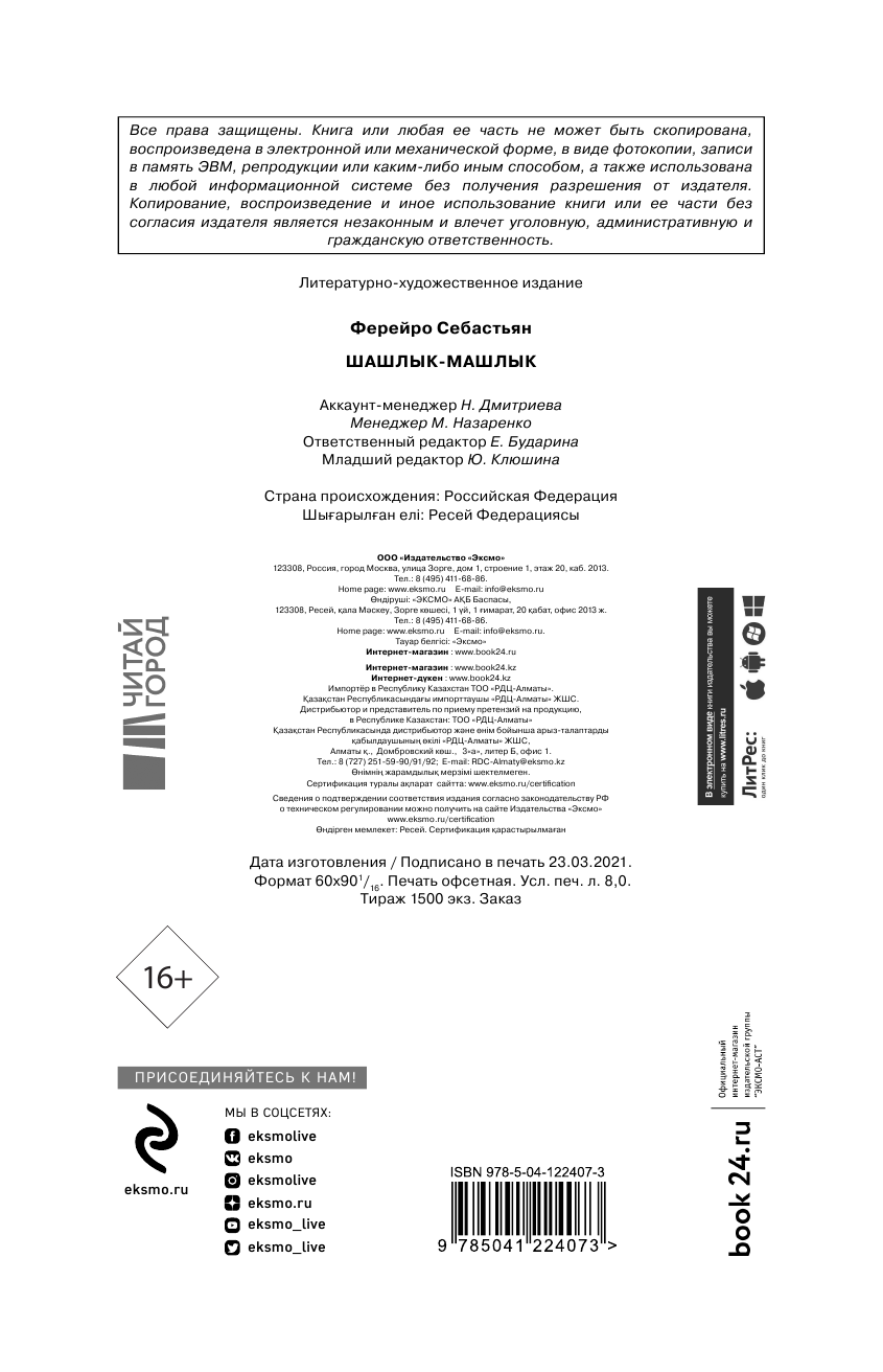 На сегодняшний день товар «Книга: Шашлык-машлык (Ферейро Себастьян); ООО "Издательство "Эксмо", 2021» можно купить с кешбеком в 3 магазинах: book24, Буквоед, Читай-город