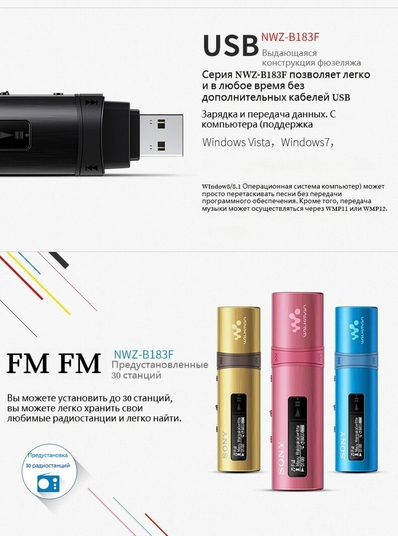 Портативный медиаплеер Sony NWZ-B183F Blue MP3-плеер WalkmanR емкостью 4 ГБ с USB в новом дизайне в оригинальным алюминиевом корпусе. Функция BASS Boost, быстрая подзарядка, прямой вход USB, удобная передача файлов, FM радио.