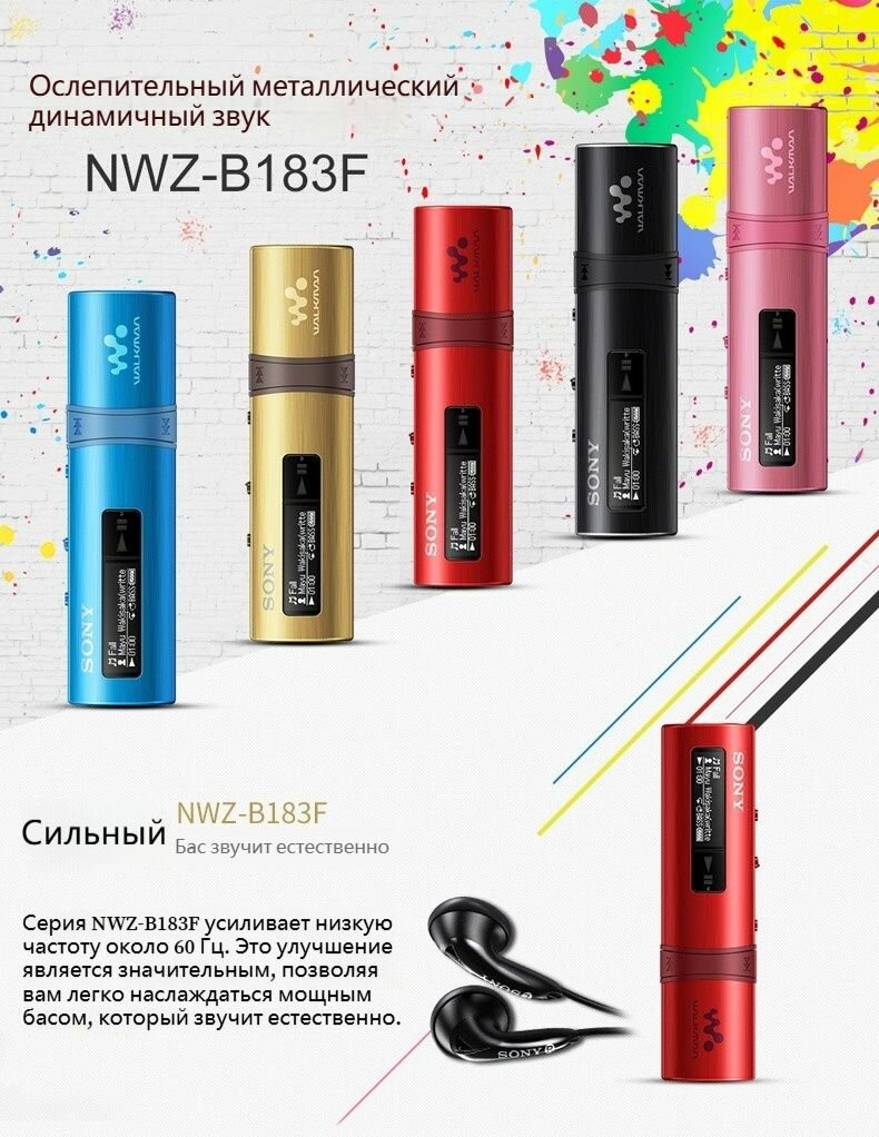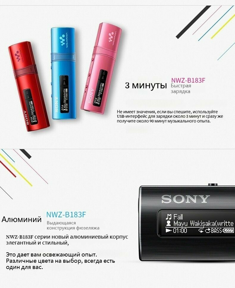 Плеер Sony NWZ-B183F с яркой светодиодной подсветкой. Более насыщенные басы: Даже если вы слушаете музыку с низким уровнем громкости, вы сможете насладиться мощными, глубокими басами одним нажатием кнопки. Быстрая подзарядка: Всего три минуты подзарядки плеера - и вы сможете слушать его в течение полутора часов. При полной зарядке вы можете слушать музыку до 20 часов.