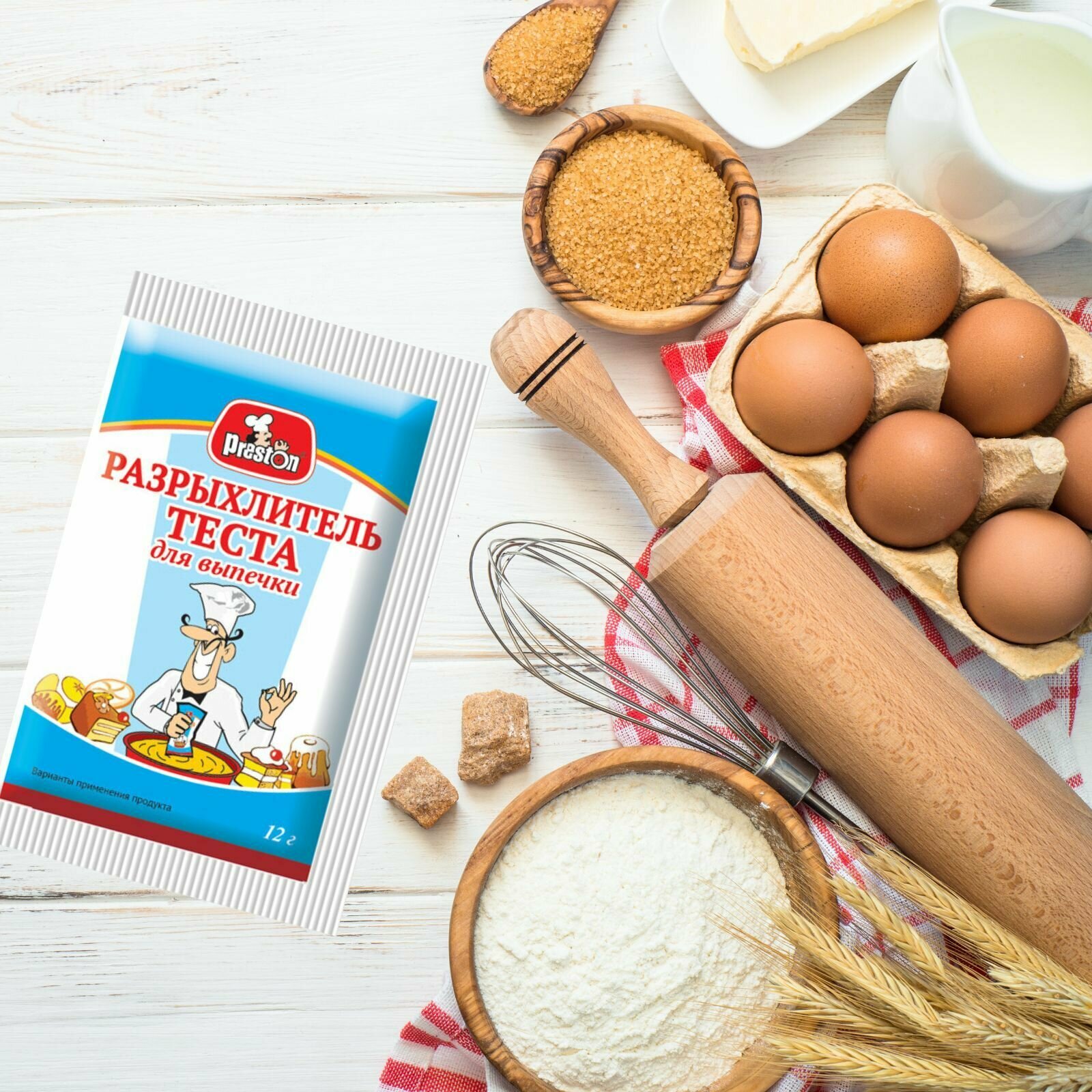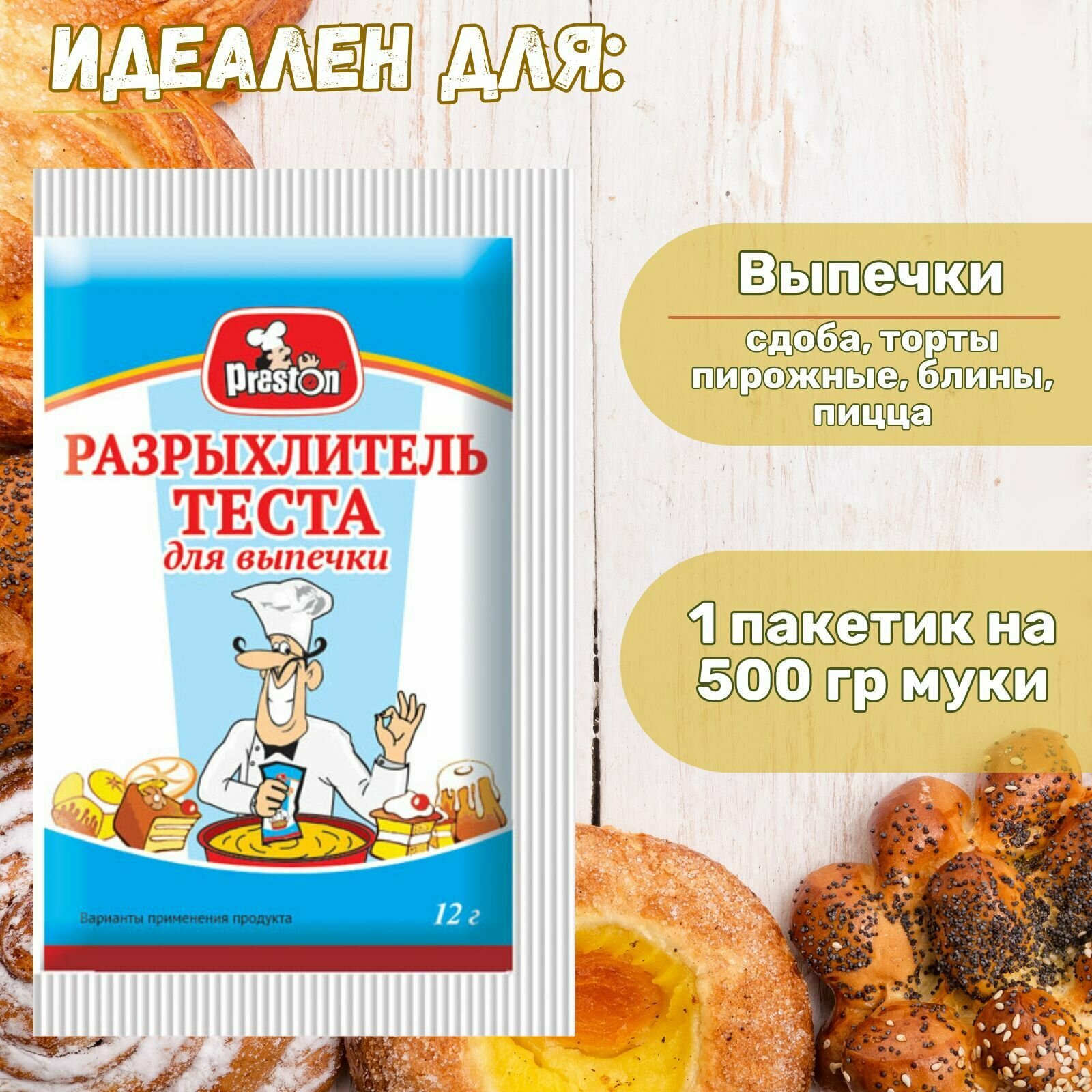 Не секрет, что домашняя выпечка намного полезнее и вкуснее покупной. Традиции домашней выпечки всегда были крепкими в российских семьях. Как приятно из кухни разносится аромат свежеиспеченного пирога, рулета или кекса.Под торговой маркой Pr. Preston производится специальная серия в помощь пекарю и кондитеру. Качественные дрожжи как быстродействующие, так и хлебопекарные, разрыхлитель теста сделают тесто пышным и рыхлым.Разрыхлитель – это порошок, используемый для придания рыхлости и пышности продукту. Он является аналогом соды в кондитерском применении, иногда его называют «пекарским порошком». Идеально разрыхлитель подойдет при приготовлении блинов, домашних пирогов, пончиков, печенья и кексов. Способ применения: на 500 г муки 1 пакетик. Основы использования:- используется только в сухом виде. Порошок нужно только тщательно смешать с мукой, и только потом добавить все это в остальные ингридиенты;- при использовании разрыхлителя, тесто, которое начнет подниматься, нужно сразу же выпекать – перемешивать после поднятия не рекомендуется. Выделяемый углекислый газ очень быстро начинает улетучиваться, что в итоге может привести к тому, что тесто просто не поднялось при выпекании.