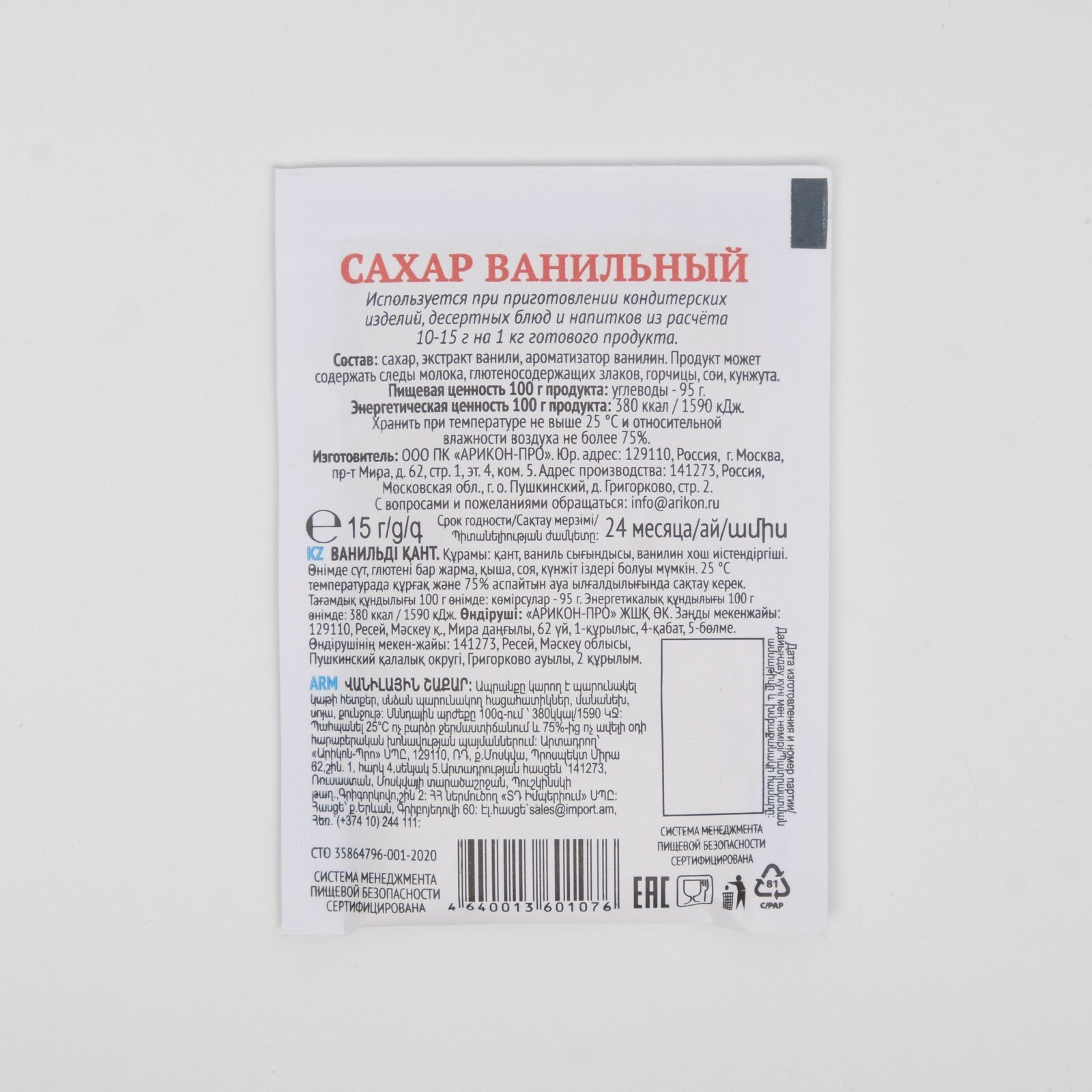 | Вид сахара | Пакетированный |
