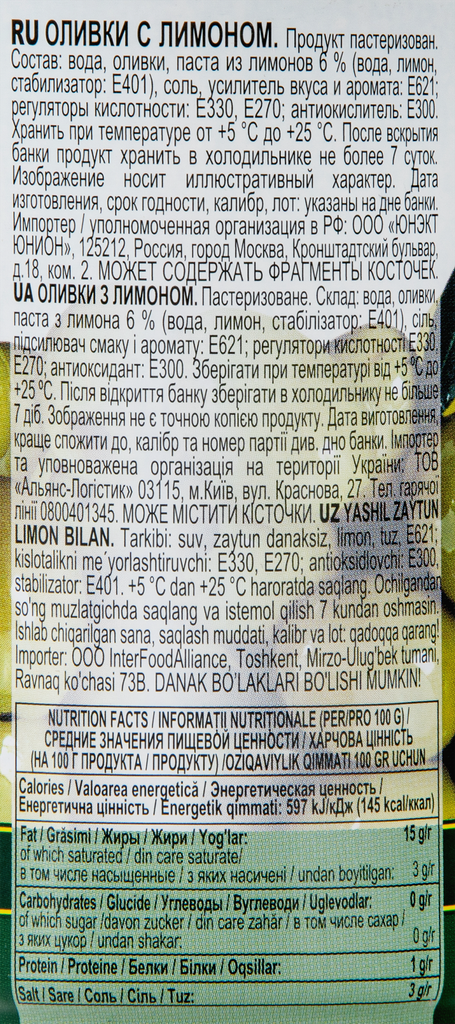Состав | Вода, оливки, паста из лимонов 6% (вода, лимон, стабилизатор: Е401, Е407), соль, усилитель вкуса и аромата: Е621, регуляторы кислотности |