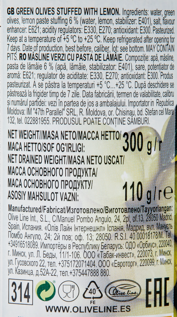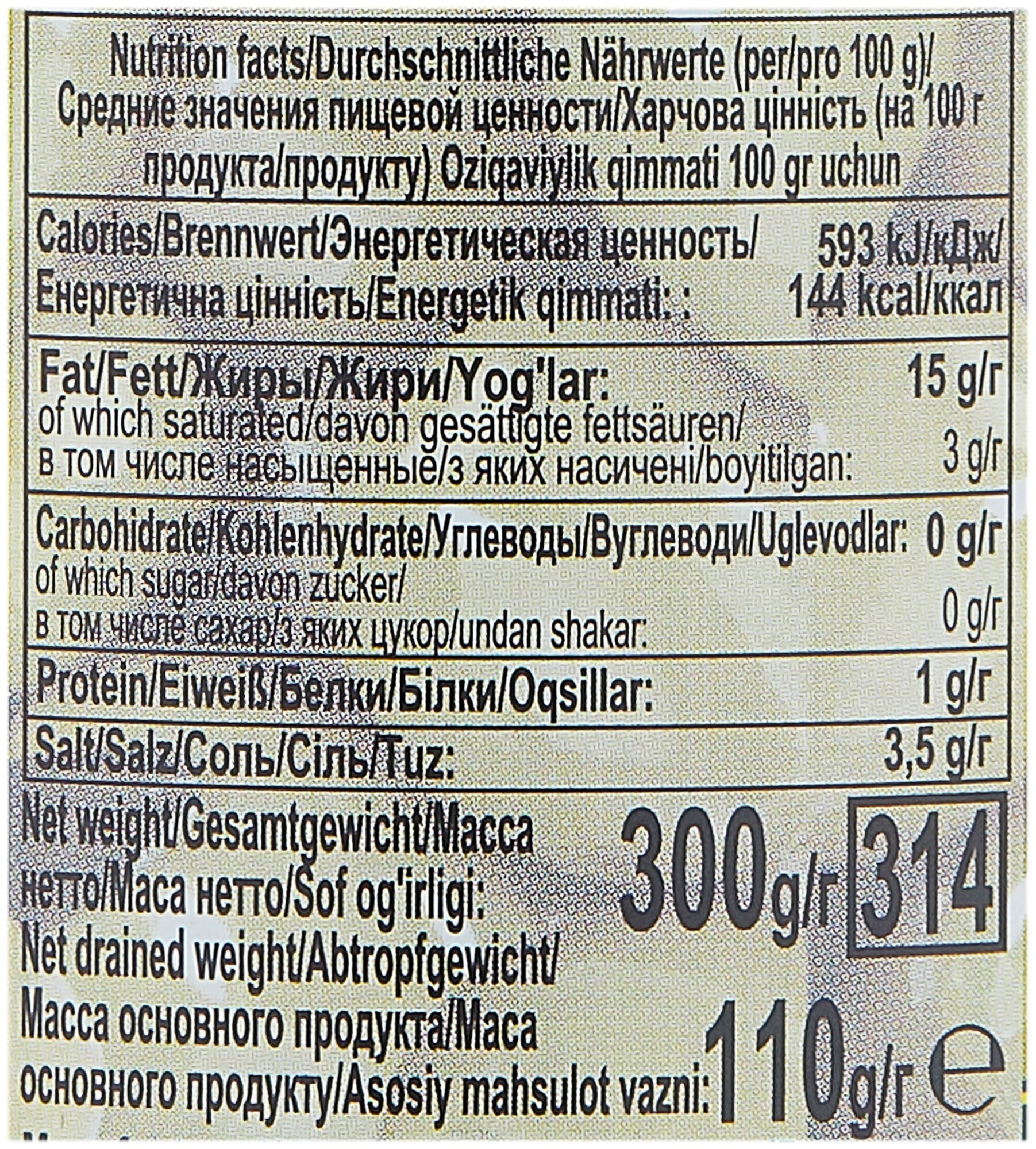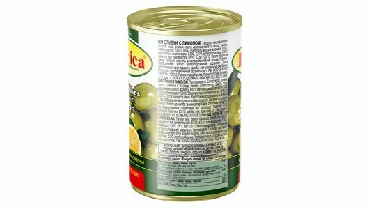 | Состав | Вода, оливки, паста из лимонов 6% (вода, лимон, стабилизатор: Е401, Е407), соль, усилитель вкуса и аромата: Е621, регуляторы кислотности |