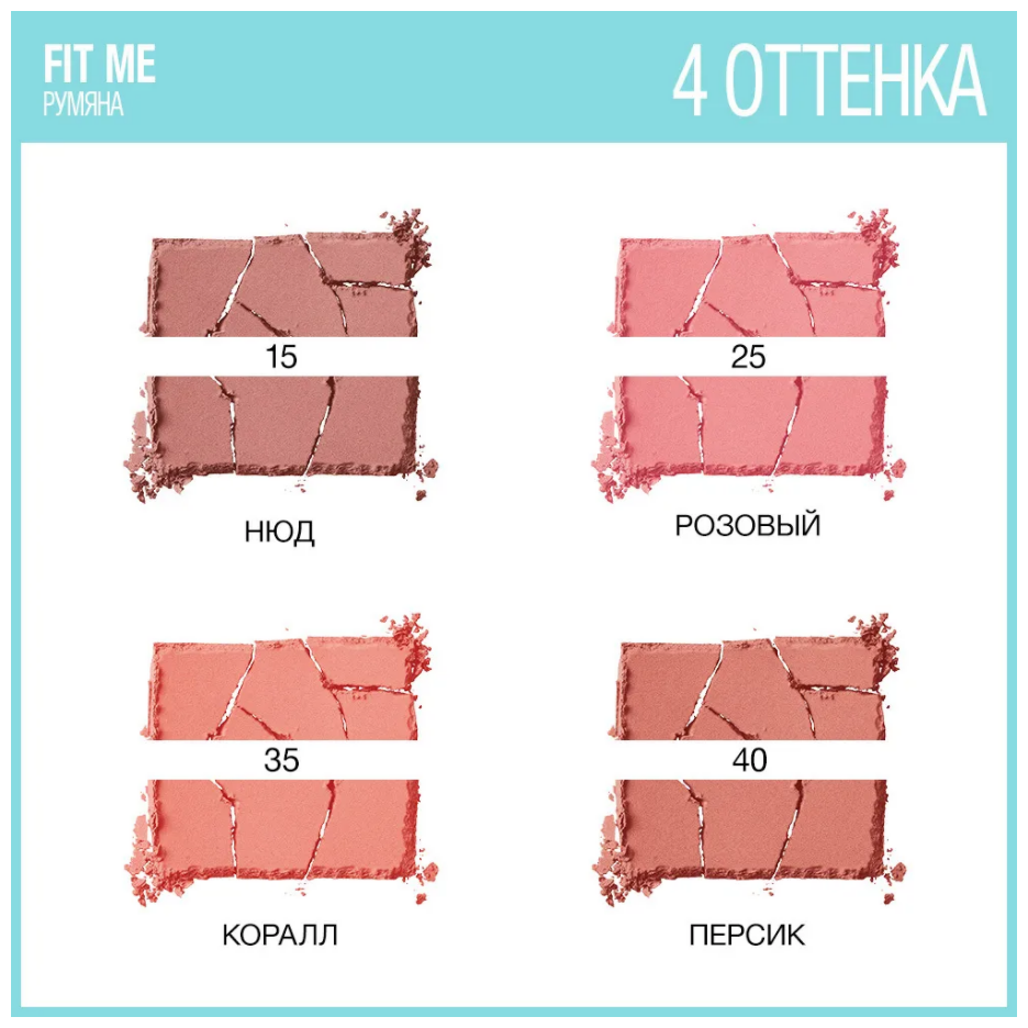 Румяна для лица MAYBELLINE NEW YORK Fit Me Blush. Новые пигментированные румяна для лица от Fit me! Шелковистая текстура равномерно наносится на кожу, идеально сочетаясь с другими средствами для лица, и усиливая естественный румянец, придавая здоровый и свежий вид.