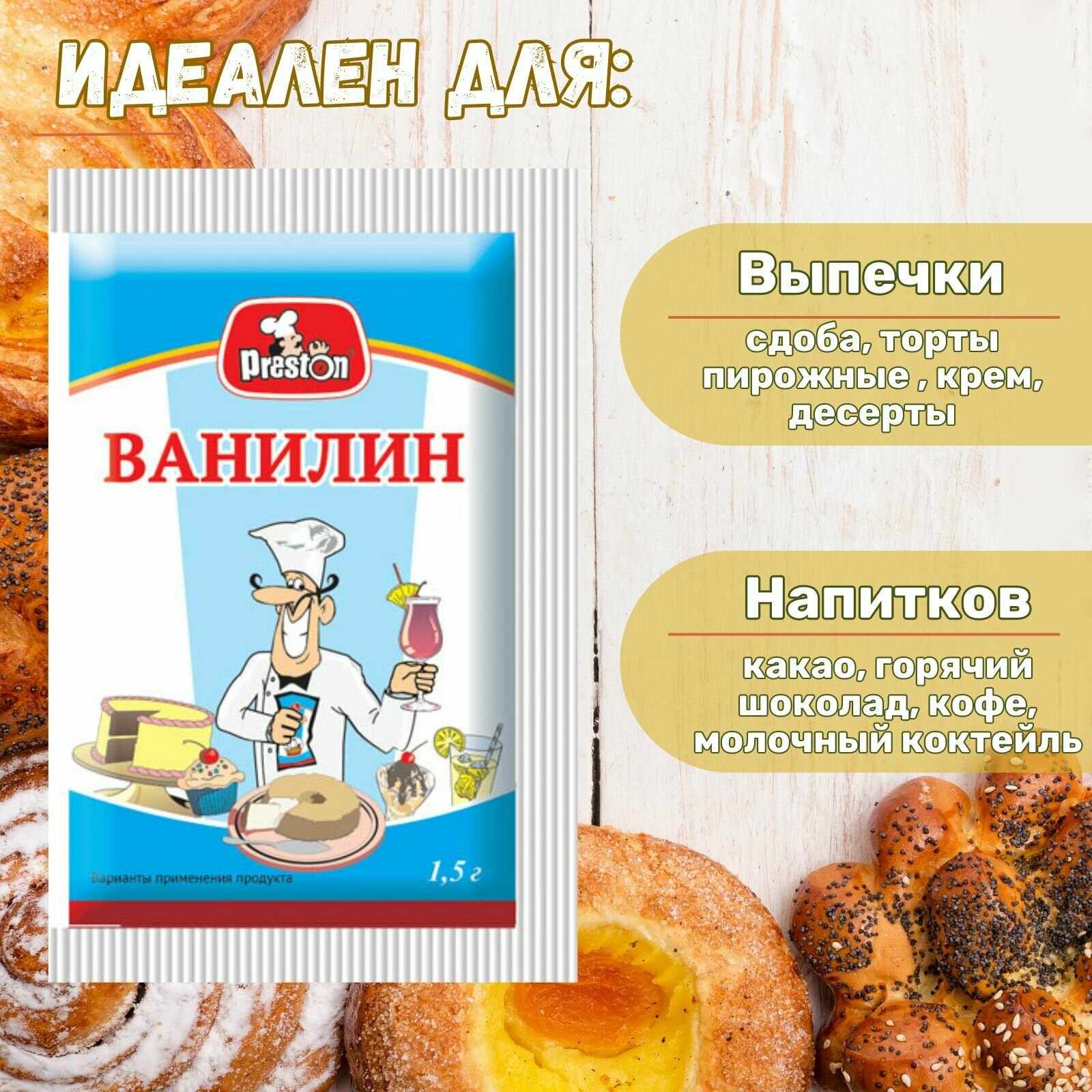 Не секрет, что домашняя выпечка намного полезнее и вкуснее покупной. Традиции домашней выпечки всегда были крепкими в российских семьях. Как приятно из кухни разносится аромат свежеиспеченного пирога, рулета или кекса.Под торговой маркой Pr. Preston производится специальная серия в помощь пекарю и кондитеру. Pr. Preston поможет вам готовить десерты вкусно, ароматно, красиво, по-настоящему празднично.Ваниль с древних времен является одной из самых популярных пряностей в мире. Плоды ее - маслянистые и эластичные стручки темно-коричневого цвета. Эти стручки ничем не пахнут до тех пор, пока их не обдадут паром. Те белые кристаллы, которые появятся на поверхности и являются тем самым натуральным ванилином с характерных ароматом. Именно этот аромат способствует выработке серотонина, отвечающего за удовольствие. Ванилин, так же как и ваниль, снижает раздражение, гнев, усталость и придает спокойствие и расслабляет нервную систему. Сейчас ванилин - это ароматизатор идентичный натуральному и представляет собой белые кристаллы, которые хорошо растворяются в воде. Для снижения концентрации, ванилин смешивают с сахаром. Его успешно используют при приготовлении хлебо-булочных изделий и кондитерском производстве. Широко так же используют в косметологии и фармакологии.