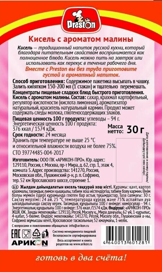 Кисель хорош всегда: во время завтрака и в качестве легкого перекуса в течение дня. Кисель с ароматом малины Preston порадует отличным вкусом и легкостью приготовления. Все что нужно - это высыпать содержимое пакетика в чашку и залить 150-200 г. кипятка. Несколько вращательных движений – и он готов! В комплекте - 9 шт.