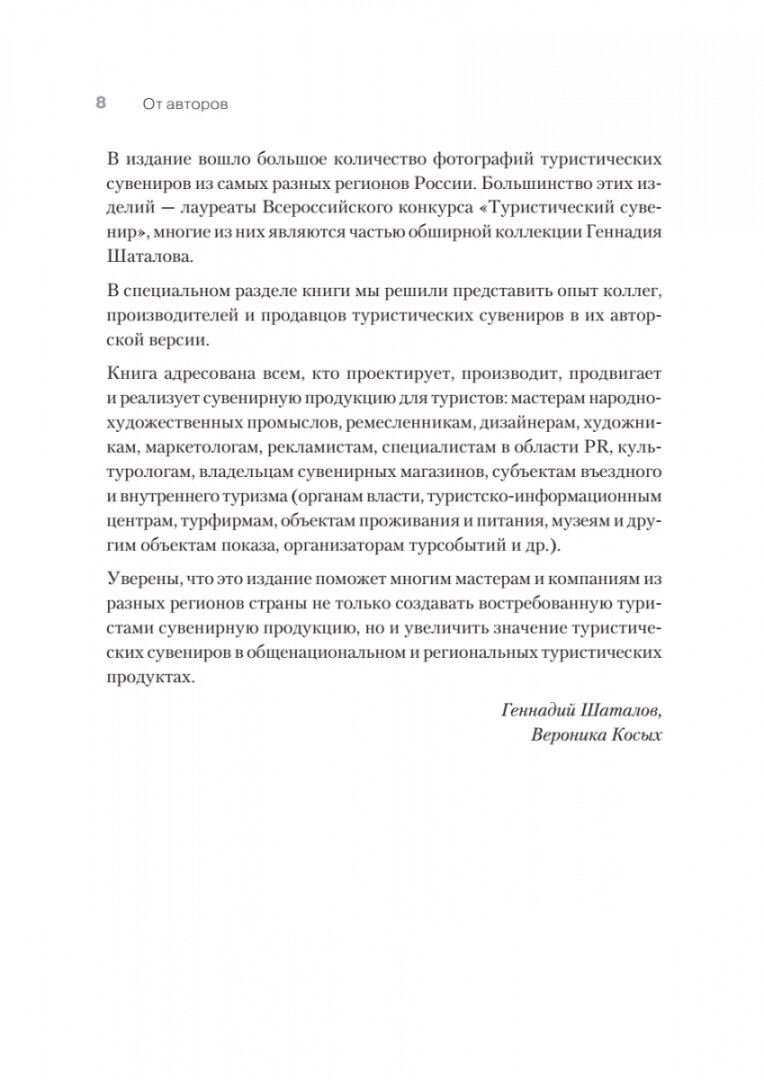 Книга предназначена для мастеров народно-художественных промыслов, ремесленников, дизайнеров, художников, маркетологов, рекламистов, специалистов в области PR, культурологов, владельцев сувенирных магазинов, субъектов въездного и внутреннего туризма (органов власти, ТИЦ, турфирм, объектов проживания, питания, музеев и других объектов показа, организаторов турсобытий и др.) - для всех, чья деятельность связана с созданием или продажей сувенирной продукции, и для тех, кто заинтересован в повышении спроса на такую продукцию.