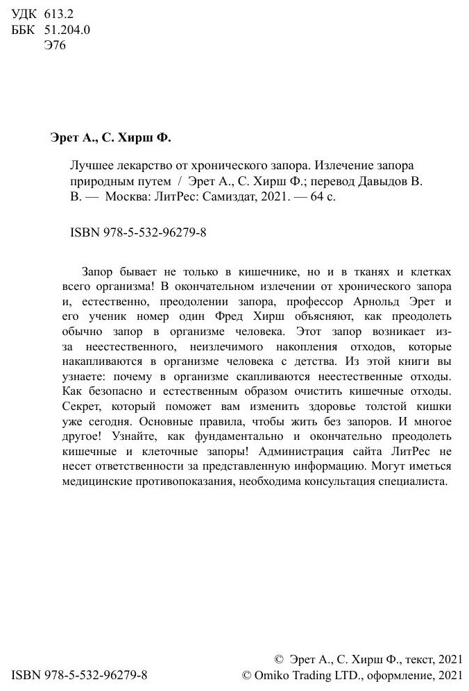 Лучшее лекарство от хронического запора. Излечение запора природным путем (Арнольд Эрет); Автор, 2021