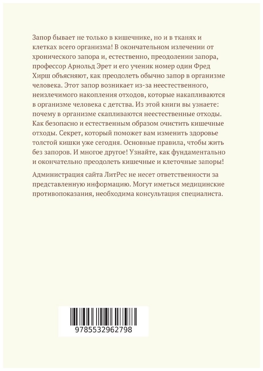 Запор бывает не только в кишечнике, но и в тканях и клетках всего организма! В окончательном излечении от хронического запора и, естественно, преодолении запора, профессор Арнольд Эрет и его ученик номер один Фред Хирш объясняют, как преодолеть обычно запор в организме человека. Этот запор возникает из-за неестественного, неизлечимого накопления отходов, которые накапливаются в организме человека с детства. Из этой книги вы узнаете: почему в организме скапливаются неестественные отходы. Как безопасно и естественным образом очистить кишечные отходы. Секрет, который поможет вам изменить здоровье толстой кишки уже сегодня. Основные правила, чтобы жить без запоров. И многое другое! Узнайте, как фундаментально и окончательно преодолеть кишечные и клеточные запоры!