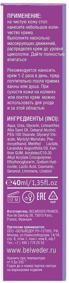 ПРИМЕНЕНИЕ: на чистую кожу стоп нанесите небольшое количество крема. Выполните несколько массирующих движений, распределяя крем до щиколотки. Дайте полностью впитаться. Рекомендуется наносить крем 1-2 раза в день, предпочтительно после приема ванны или душа. При умеренной сухости кожи на коленях и локтях крем можно использовать для ухода за этой областью.