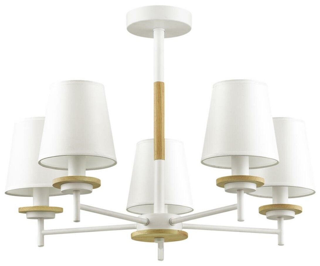 Люстра понравится ценителям естественности и простоты и поможет в создании уютной домашней атмосферы. Она подойдет для современных интерьеров с элементами скандинавского или деревенского стилей. Особенно выразительно модель будет смотреться в сочетании с деревянной мебелью или паркетом, ведь в ее отделке используются элементы из натуральной древесины медового оттенка. Металлическое основание прибора окрашено по технологии стойкого порошкового напыления. Текстильные абажуры со строгим кантом по краям мягко рассеивают световой поток.