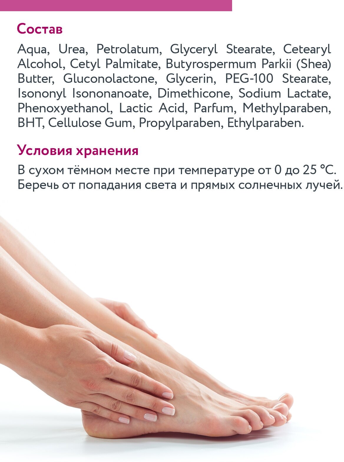 | Способ применения | 1. Точечное использование. Нанести небольшое количество крема массажными движениями на проблемные участки до полного впитывания. 2. Питание и восстановление. Нанести небольшое количество крема (тонким слоем) массажными движениями на кожу стоп и голеней до полного впитывания. 3. Глубокое увлажнение и обновление. Нанести небольшое количества крема на кожу стоп и голеней. Сверху наденьте специальные носочки для педикюра или хлопковые носки. Крем можно оставить на 20-30 минут или на ночь. Для достижения максимального эффекта рекомендуется наносить крем ежедневно. Крем можно использовать для сухой кожи на локтях. |