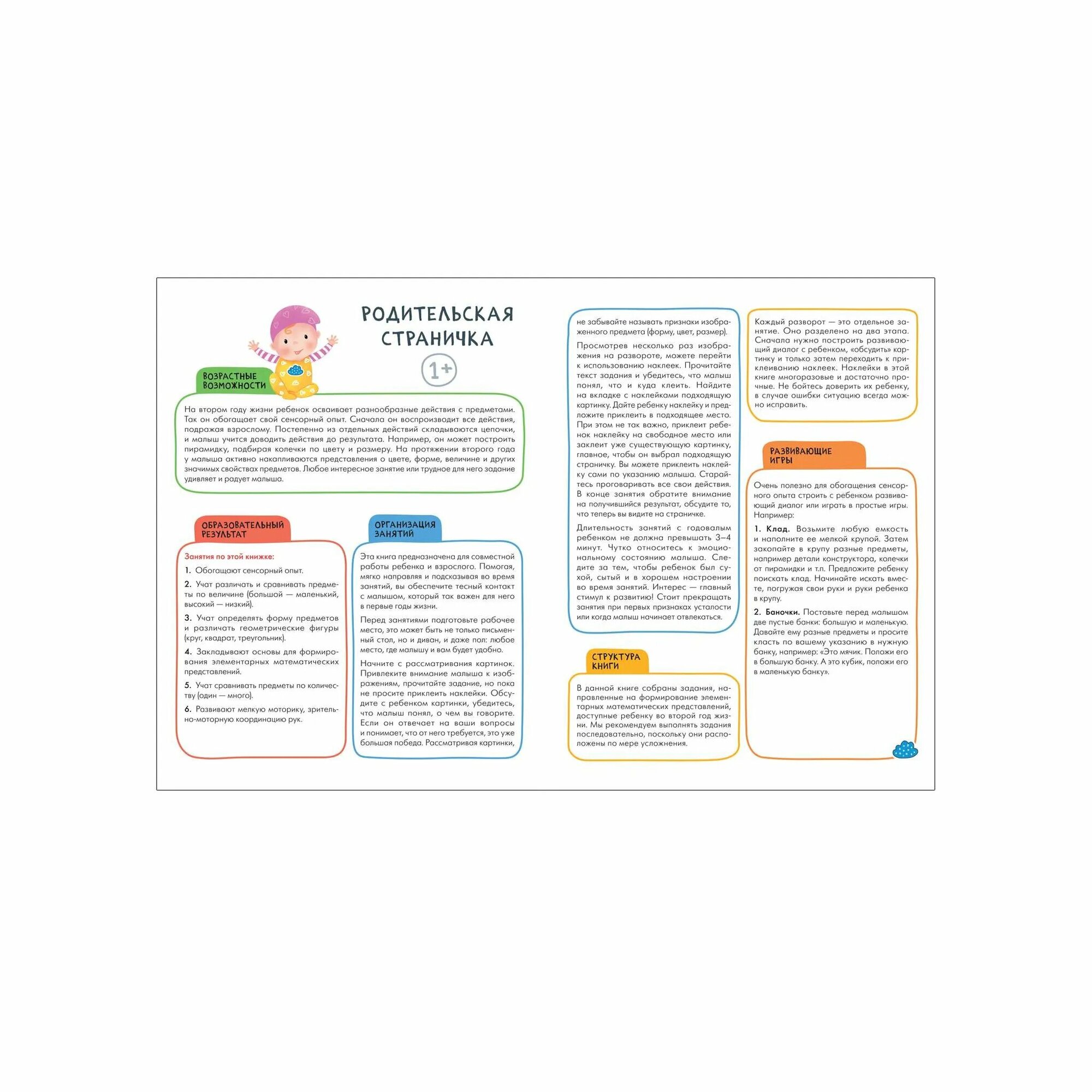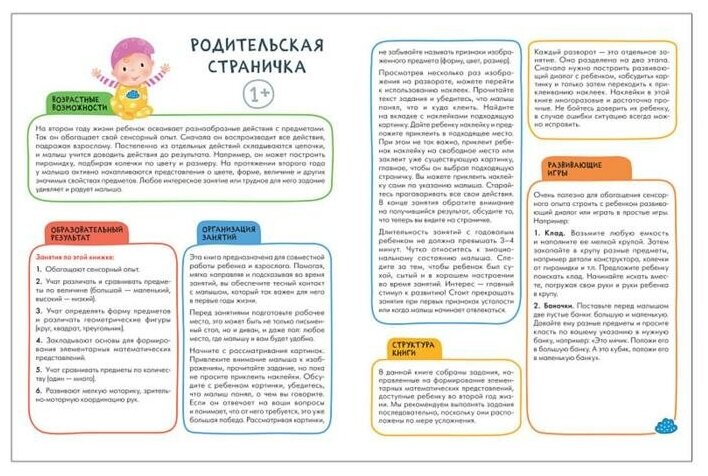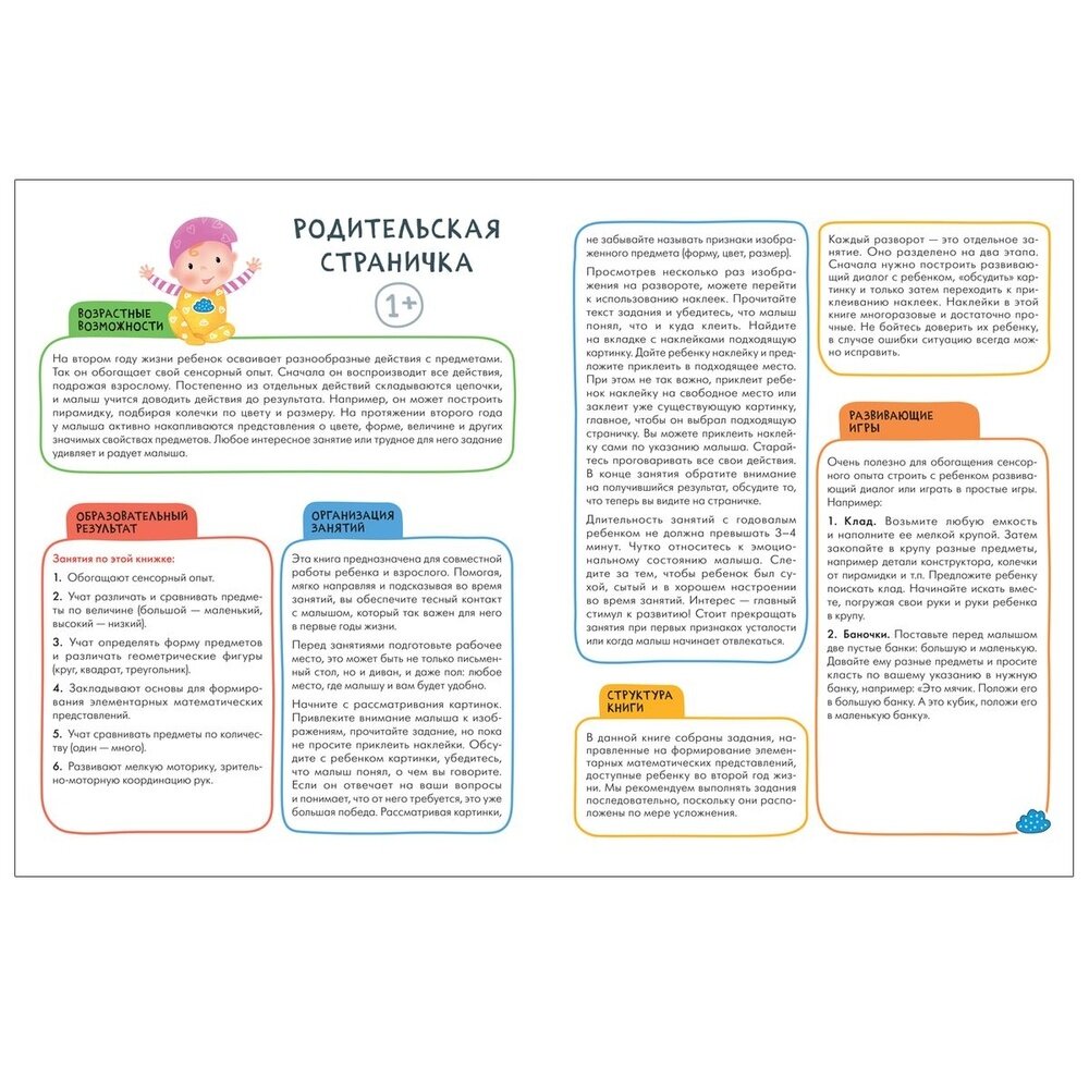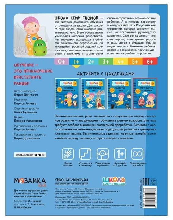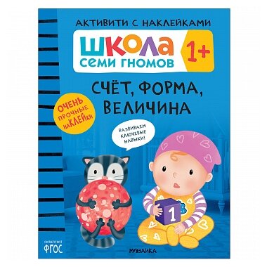Книга «Счет, форма, величина 1+» из серии «Школа Семи Гномов. Активити с наклейками» предназначена для формирования и развития у детей от 1 года до 2 лет элементарных математических представлений, способности сопоставлять величину предметов, определять их форму.