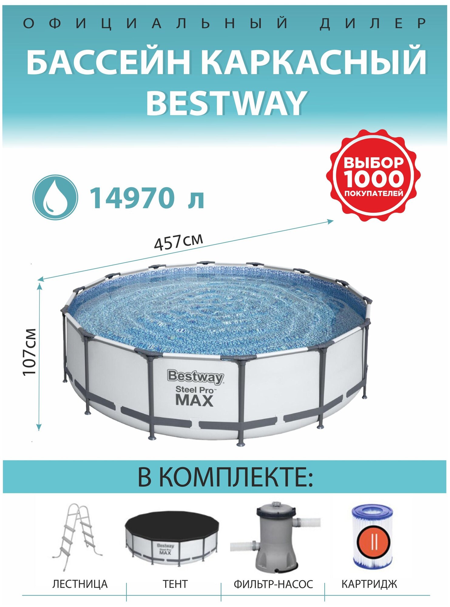 Бассейн каркасный круглый с фильтрнасосом Bestway Steel Pro Max 457х107 см 14970лБассейн каркасный Bestway Steel Pro Max размером 457х107 см — для активного или спокойного отдыха всей семьей. Бассейн можно установить в любом месте, в помещении или на улице, где есть плоская горизонтальная поверхность. Собрать и подключить бассейн можно за 12 часа. Благодаря удобному сливному клапану можно присоединить садовый шланг, что дает возможность слить воду куда угодно. Металлический каркас покрыт слоем пластика, предотвращающим появление коррозии. Чаша бассейна сделана из трехслойного ПВХ высокого качества: два слоя плотного винила, между которыми для особой прочности сетка из полиэстера. В комплект для бассейна входят тент #58038, лестница # 58330 107 см, инструкция, фильтрнасос #58386 (3 028 л / ч), картридж фильтра # 58094 Gr. II (10,6 x 13,6 см).Характеристики каркасного бассейна Bestway Steel Pro Max:Размер: d 457 x 107 см;Объем: 14 970 литров;Подкладка для бассейна из прочного материала DuraPlus;Цвет серый;Облицовка интерьера мозаикой из гальки;Возможна простая сборка без инструментов;Чрезвычайно жесткая конструкция рамы с защитой от коррозии для повышения прочности и долговечности;FrameLinkSystem с Тобразными соединителями из пластика предотвращает повреждение ржавчины между стержнями и защищает от деформации;Лента ПВХ обеспечивает дополнительную устойчивость боковых стенок;Встроенный сливной клапан с адаптером для садового шланга;Производительность фильтрнасоса: 3028 л/ч;Вес упаковки: 58 кг;Размер упаковки (см): 59.5 х 116 х 42 см;Объем упаковки (м3): 0.3Bestway — известный производитель в сфере товаров для отдыха. Эта крупная компания имеет огромные производственные мощности, которые позволяют осуществить полный цикл производства товаров. Именно благодаря этому товары Bestway такие недорогие, и при этом имеют хорошее качество. Бассейны Bestway имеет большую популярность у российских пользователей, наряду с бассейнами Intex, EasyMarket, Aquamarine KIDS, Swing Pools, Jilong.Прочность и надежность товаров Бествей проверена годами. Bestway более 20 лет производит такие товары, как бассейн каркасный, бассейн надувной, спа бассейн джакузи. Каркасный бассейн Bestway — надежный выбор, при правильном использовании он прослужит вам более 5 лет. В ассортименте Bestway вы можете найти бассейн каркасный прямоугольный или круглый, с разными размерами и объемом. Бассейны для дачи от Bestway оценят по достоинству все члены семьи, а особенно самые маленькие. Бассейн надувной детский — популярный выбор для дачного отдыха всей семьей. Надувной бассейн для малышей обычно имеет небольшой размер, за ним несложно ухаживать, легко переносить. Но есть и более габаритные модели — надувной бассейн взрослый, где можно купаться всей семьей.