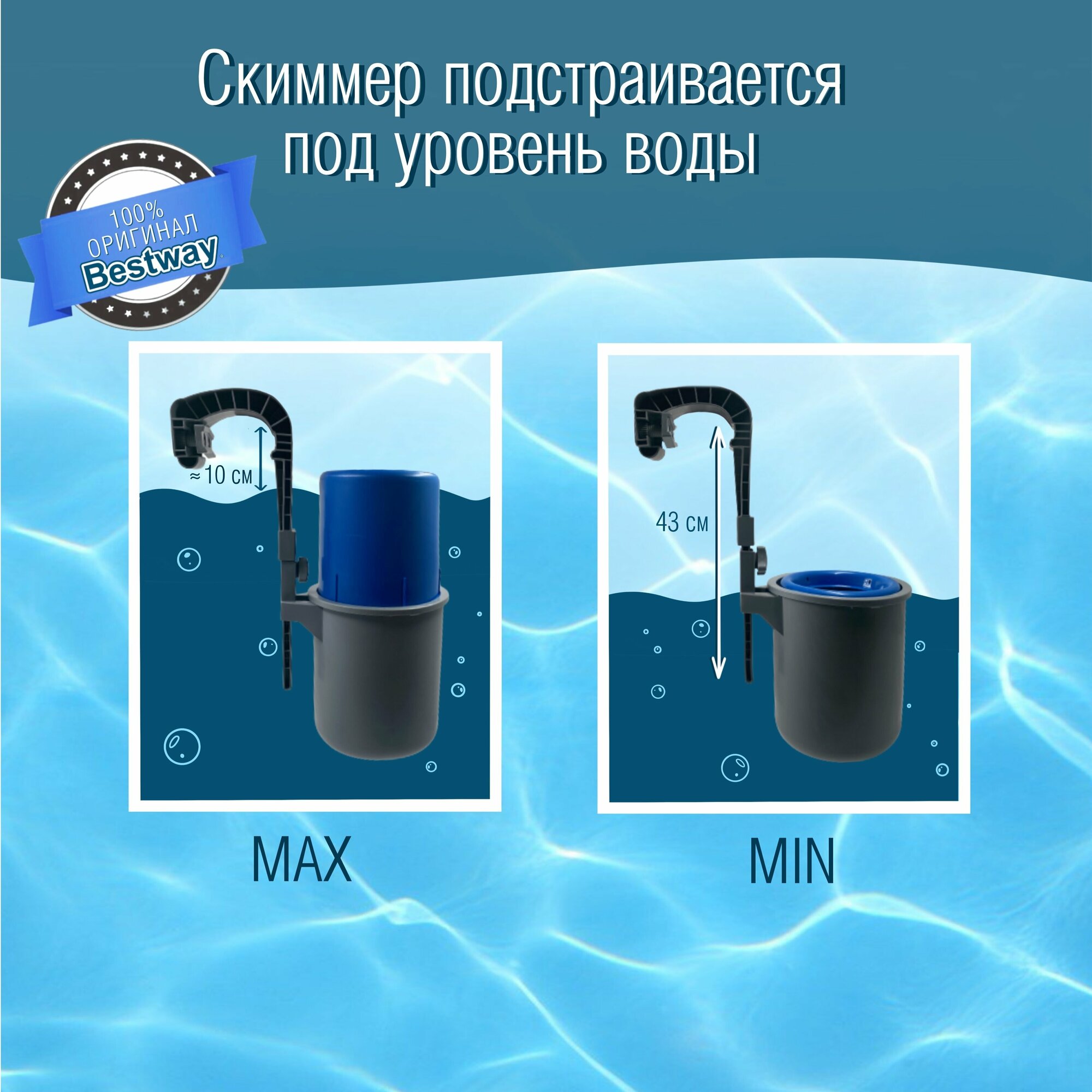 - Штатное крепление Bestway уверенно держится на каркасе бассейна, но расстраивает недостаточный диапазон регулировки глубины. Хочется поднять скиммер выше, но в максимально поднятом положении скиммер пытается всплыть и выгибает кронштейн.