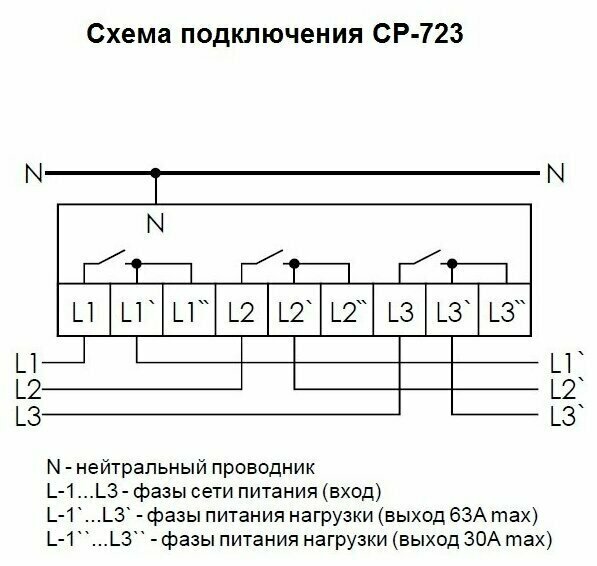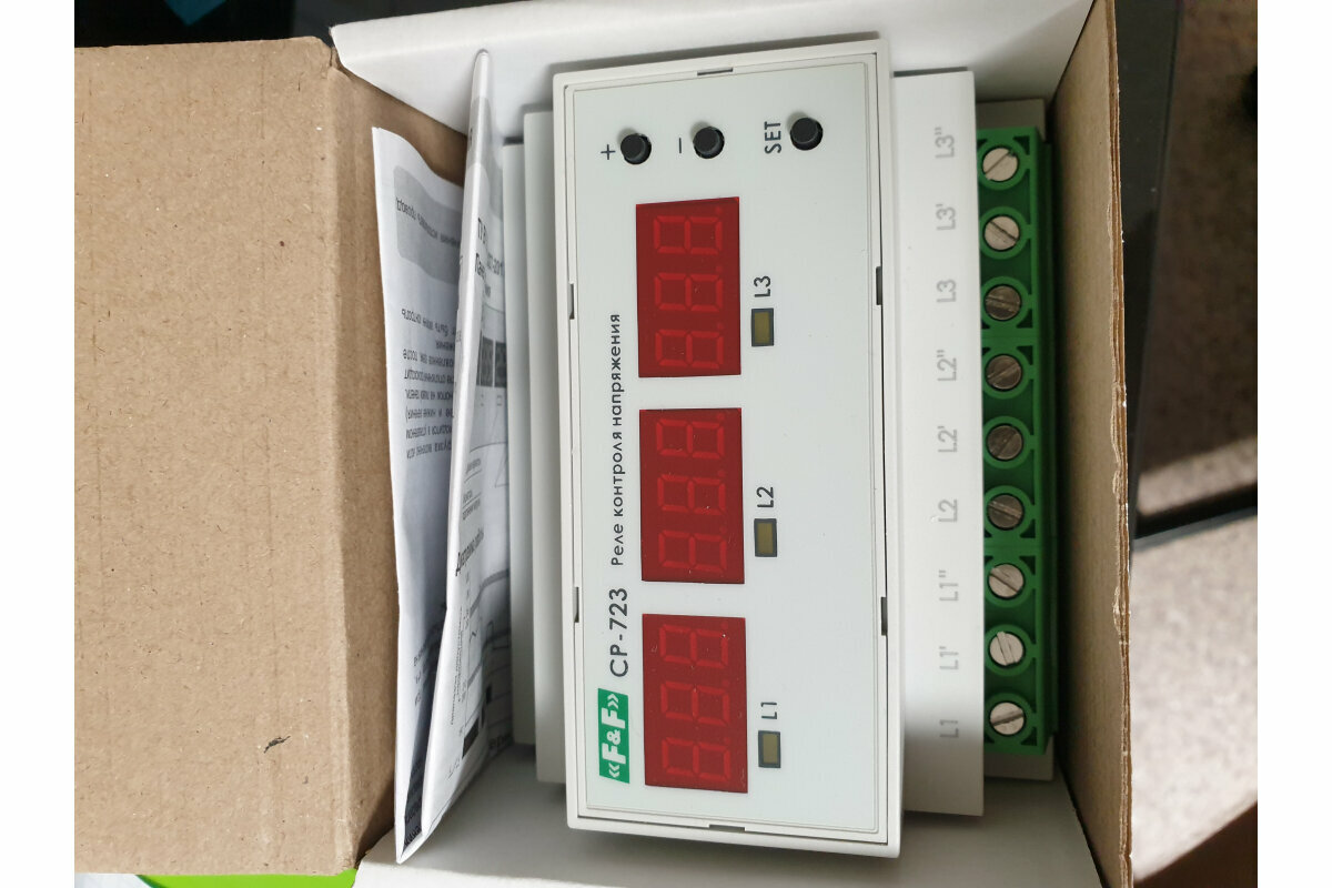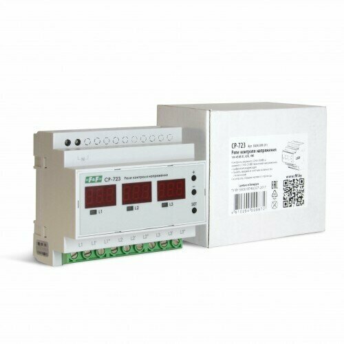 Реле контроля напряжения СР-723 предназначено для защиты однофазных и/или трехфазных электроустановок, электроприборов и прочего электронного оборудования от повышенного или пониженного напряжения.Принцип работыРеле контроля напряжения CP-723 может работать в одном из режимов:1. Три однофазных реле – каждый из каналов реле имеет свои уставки по напряжению и временным интервалам, функционируют независимо друг от друга.2. Трехфазное реле напряжения – полностью контролирует трехфазную сеть, включая асимметрию, пропадание фаз, а также чередование и “слипание” фаз (если включен контроль этих параметров). Все три канала реле коммутируются одновременно.