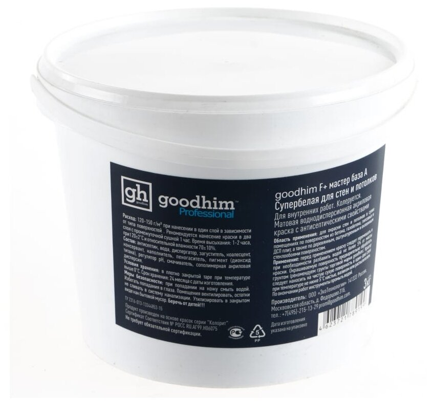 Краска акриловая GOODHIM F+ супербелая для окраски потолков и стен в сухих и влажных помещениях по поверхностям из бетона, гипсовой шпатлевки, газобетона, гипсовых и ДСП плит, а также по деревянным, оштукатуренным или оклеенным стеклообоями поверхностям. Колеровка: пастельные тона.Основные свойства:• Экономична: при использовании на грунтованной поверхности может быть нанесена в один слой. Расход: 120-150 г/м2 при нанесении в один слой в зависимости от типа поверхности.• Экологична: можно разводить чистой водой (не более 5%), не имеет неприятного запаха. • Комфортна в использовании: легко наносится любыми малярными приспособлениями (кисть, валик, краскопульт).• Быстро сохнет: 1-2 часа при температуре 20±2°С и относительной влажности 80±10%.
