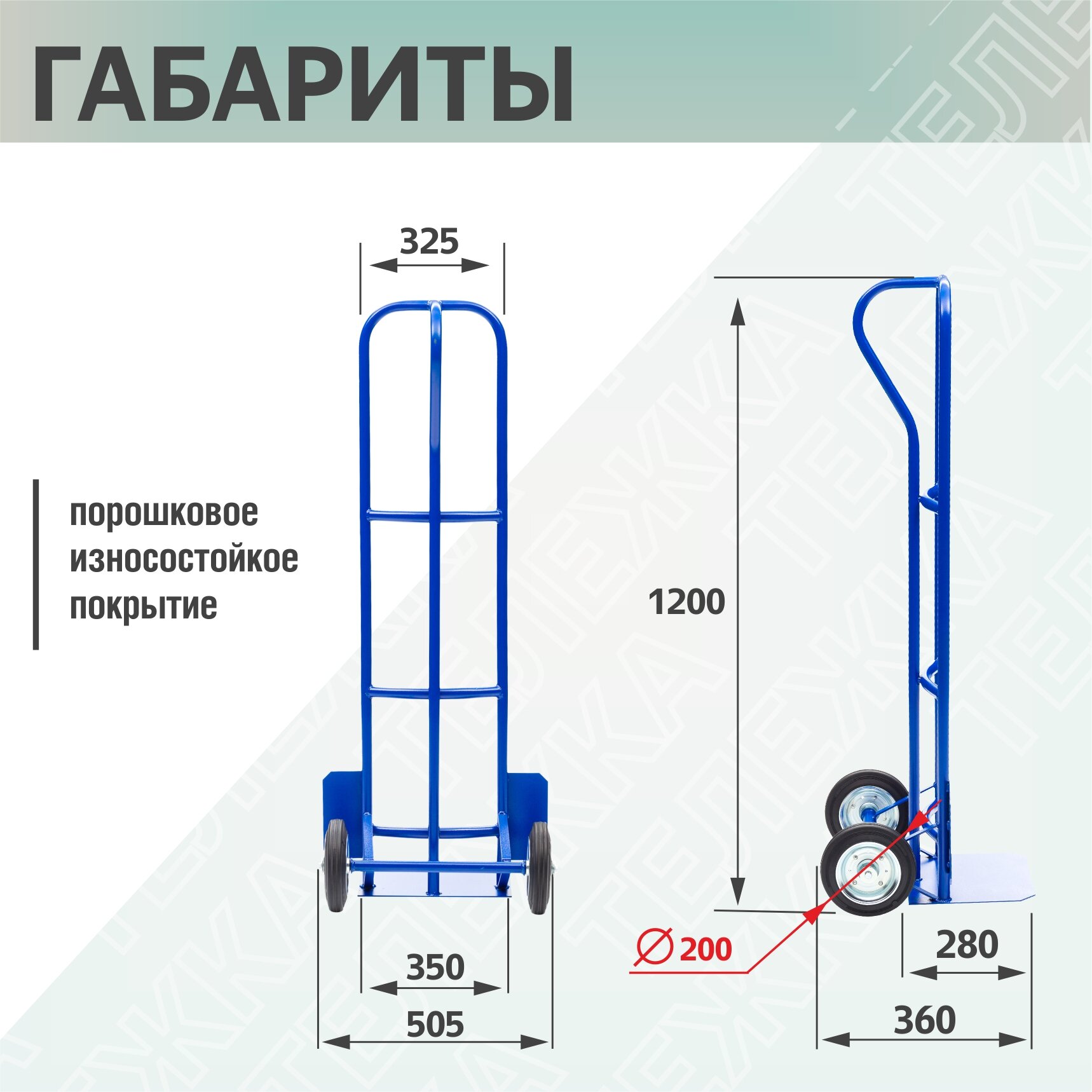Грузовая 2-х колесная тележка с одной ручкой используется для транспортировки различного малогабаритного груза весом до 200кг. на небольшие расстояния. Каркас тележки изготовлен из металлической трубы диаметром 25мм., толщиной 1,5мм. и покрыт полимерной краской для предотвращения воздействия коррозии. Грузовая площадка размером 350х280мм. обеспечивает устойчивое и надежное положение груза при транспортировке. Площадка выполнена из листа металла толщиной 4мм. Покрытие полимерное. Цвет - синий, шагрень. Тележка комплектуется: метизами для крепления, колесами из высококачественной резины, диаметром 200мм.