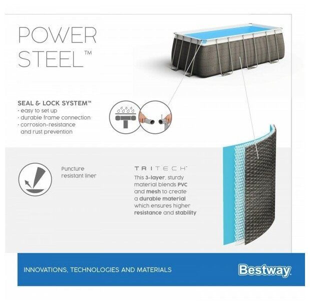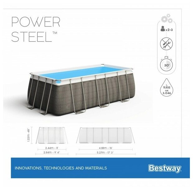 С каркасными прямоугольными бассейнами от известного производителя Bestway вы создадите прекрасный и незабываемый отдых в кругу семьи или друзей. Они быстро и легко устанавливаются, не займут у вас много сил и времени. Каркас бассейнов изготавливается из прочной нержавеющей стали, осуществляет надежную фиксацию чаши, сама чаша бассейнов выполнена из трех прочных слоев армированного ПВХ. Один слой из полиэстера и два слоя из плотного винила. Винил имеет высокую стойкость к стиранию и растягиванию, а также устойчив к воздействию окружающей среды и ультрафиолетовых лучей. Бассейн Bestway комплектуется картриджным фильтр-насосом, который обеспечит качественную очистку воды от всевозможных загрязнений, а также лестницей. Прямоугольная конструкция не имеет острых углов, что дополнительно обеспечивает безопасную эксплуатацию. Бассейн станет отличным приобретением для вас и ваших детей. Комплектация: бассейн, фильтр-насос, картридж арт. 58503, лестница, тент, дозатор для химии, инструкция.