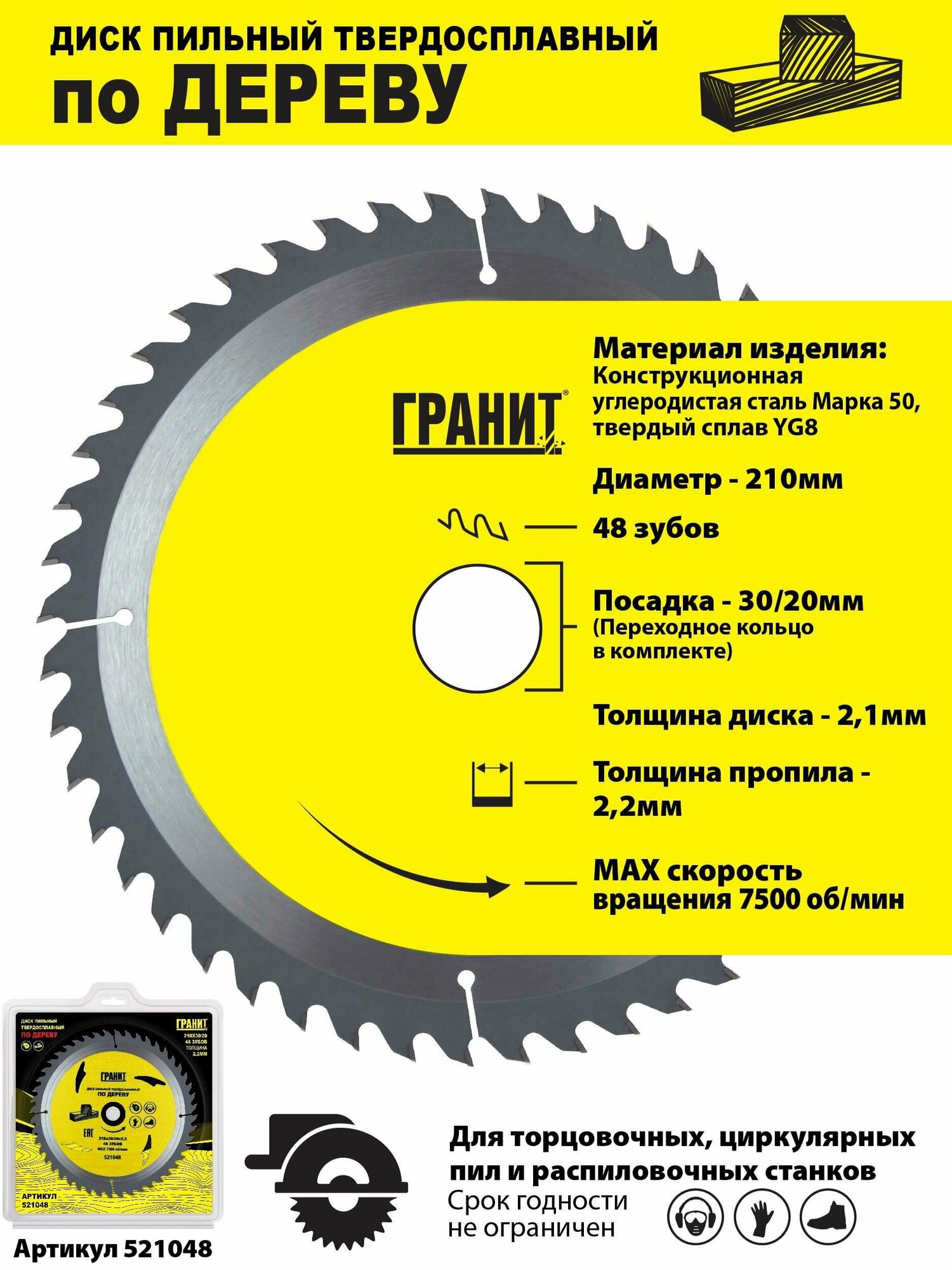 Сервис сравнения цен СкидкаГИД предлагает сравнить цены на товар «Диск пильный твердосплавный ГРАНИТ. Ф210х30/20мм 48зуб. (521048)»