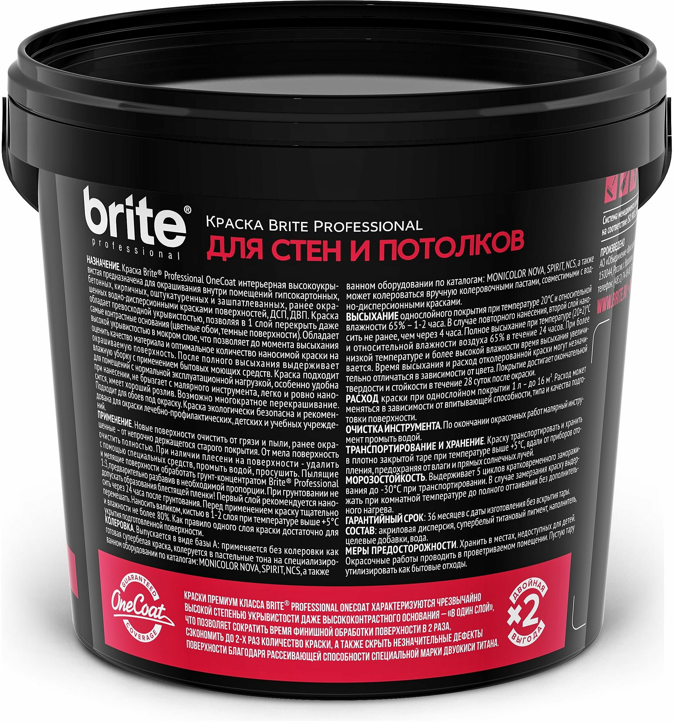 Высокоукрывистая интерьерная краска Brite One Coat для стен и потолков позволяет перекрыть в один слой самые контрастные основания и сократить время финишной обработки поверхности в 2 раза. Благодаря рассевающей способности двуокиси титана скрывает незначительные дефекты поверхности.Экологически безопасна. Рекомендована для использования в лечебно-профилактических, детских и учебных учреждениях.Преимущества-1-й класс кроющей способности по ISO 6504-3 -Возможно многократное перекрашивание-Подходит для обоев под покраску-Влажная уборка с применением моющих средств-Расход 1 л - до 16 м2Без запахаBRITE – российский бренд лакокрасочных материалов для профессионалов - отделочников, дизайнеров и домашних мастеров. Благодаря оригинальным рецептурам и новаторским компонентам материалы BRITE обладают уникальными потребительскими преимуществами, которые обеспечат вам повышенный комфорт в процессе ремонта и гарантируют стойкость к мытью, механическим повреждениям и истиранию цвета при различных условиях эксплуатации.
