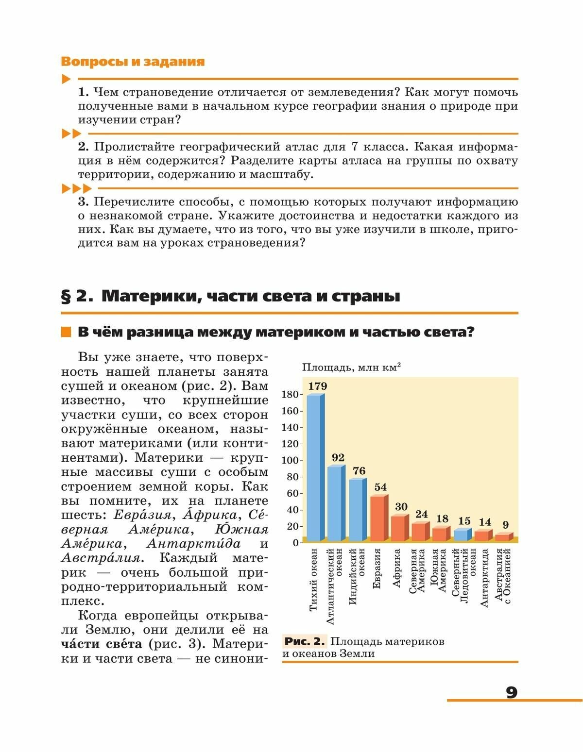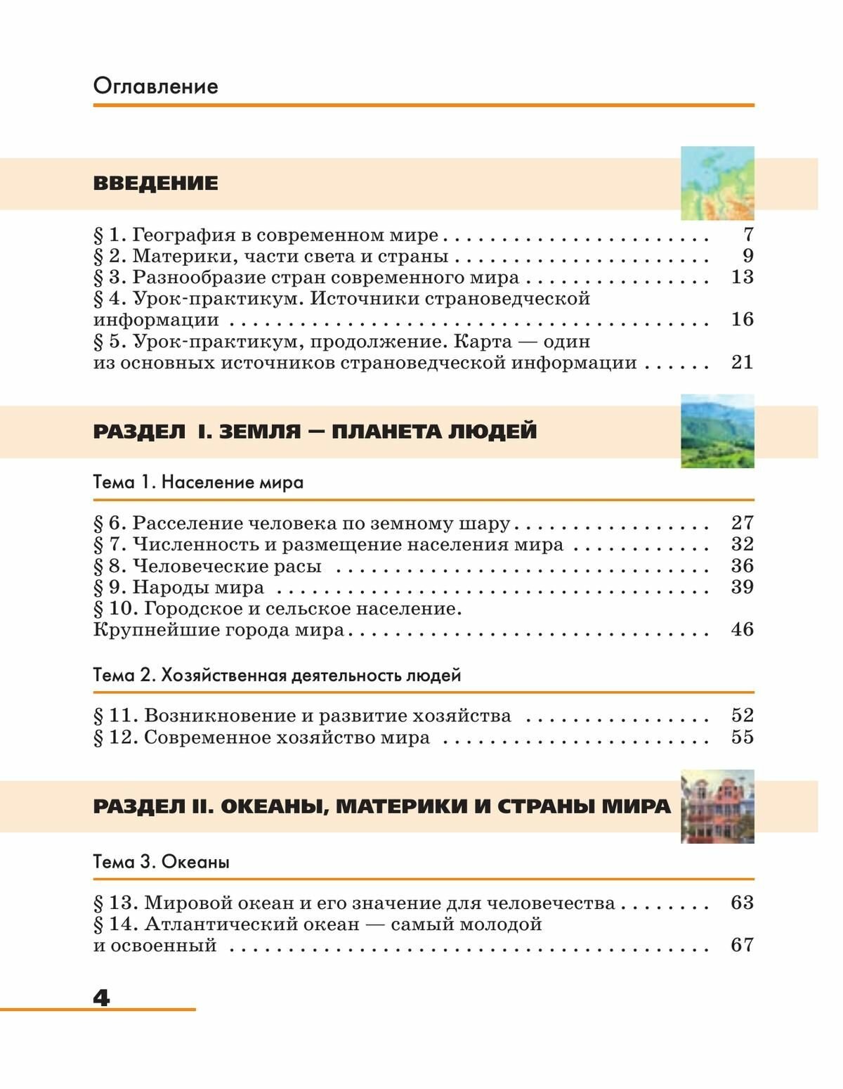 В учебнике увеличена доля страноведческой информации, причем все страны и территории рассматриваются с учетом взаимосвязей природы и хозяйства, материальной и духовной культуры населения. Первостепенное внимание уделено странам Евразии — «родного материка» россиян; в числе стран Евразии рассматривается и Россия.