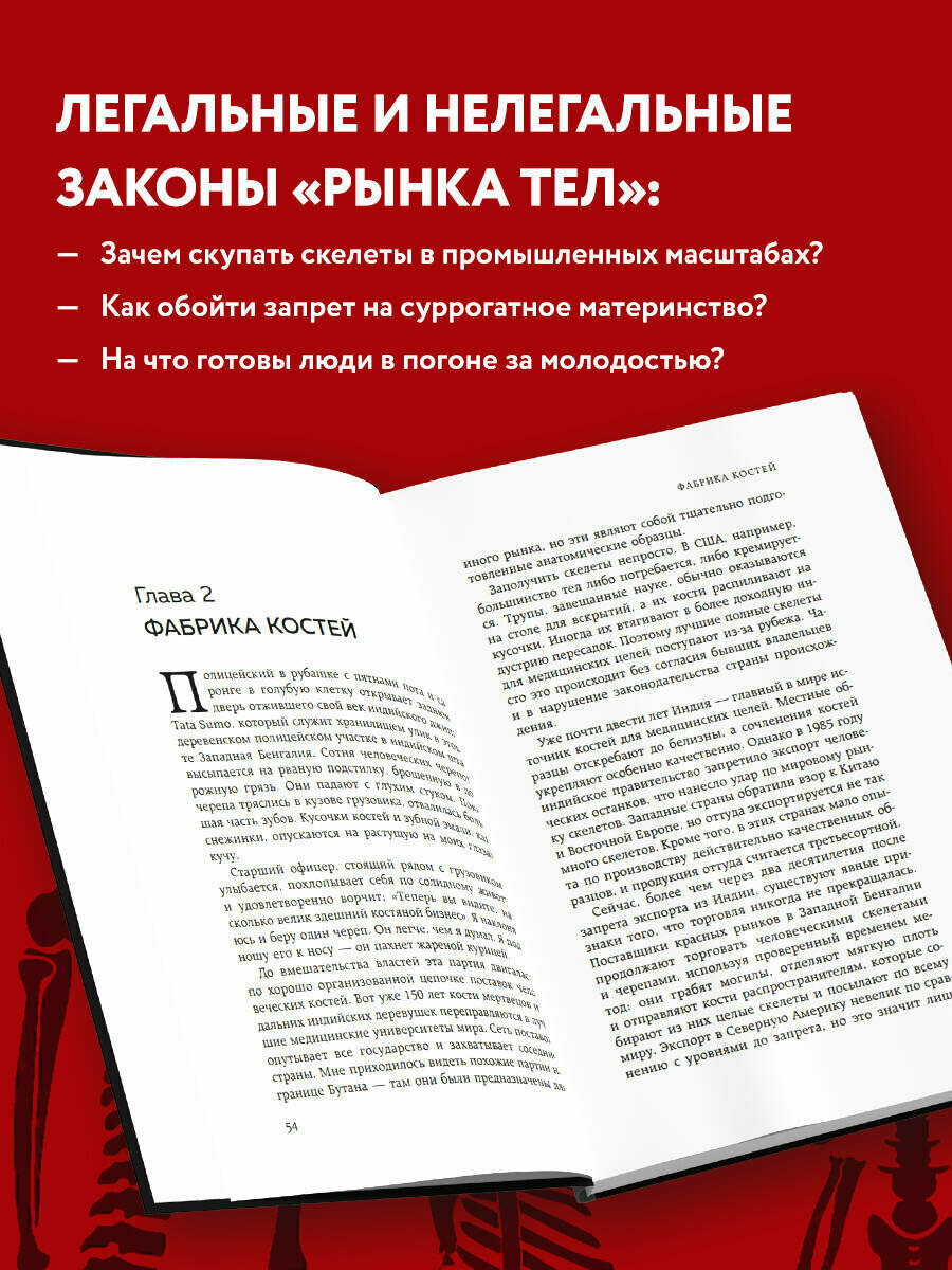 В этой книге журналист Скотт Карни, работавший для BBC и National Geographic TV, рассказывает о том, как устроен этот параллельный мир. Написанный Карни триллер разворачивается в Индии, где предметом сделки может стать что угодно — от склянки с кровью до целого скелета. Впрочем, Индией его путешествие не ограничится: желающие купить вашу почку гораздо ближе, чем кажется на первый взгляд.