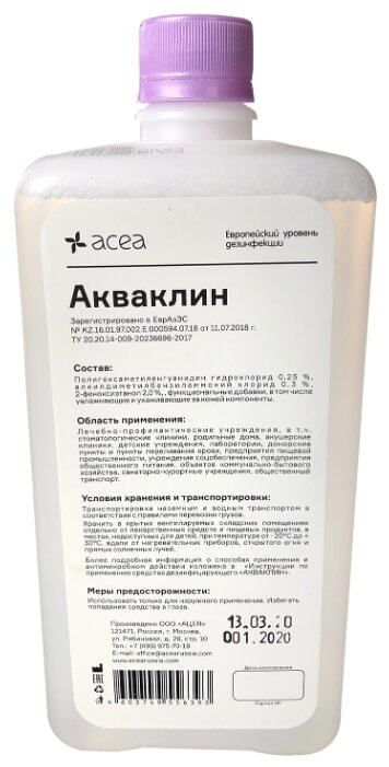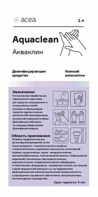 | Полное наименование | Антисептик для рук и поверхностей бесспиртовой 1 л АКВАКЛИН, дезинфицирующий, жидкость |