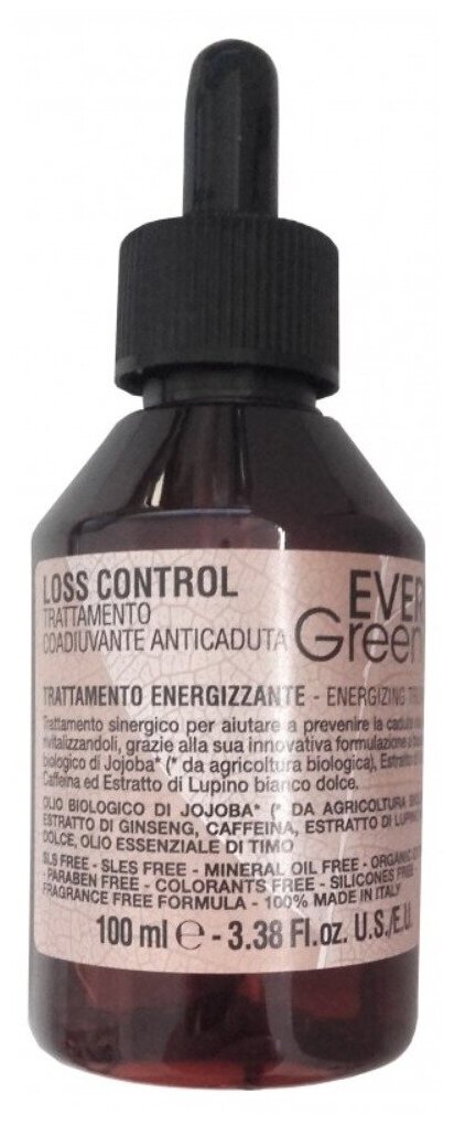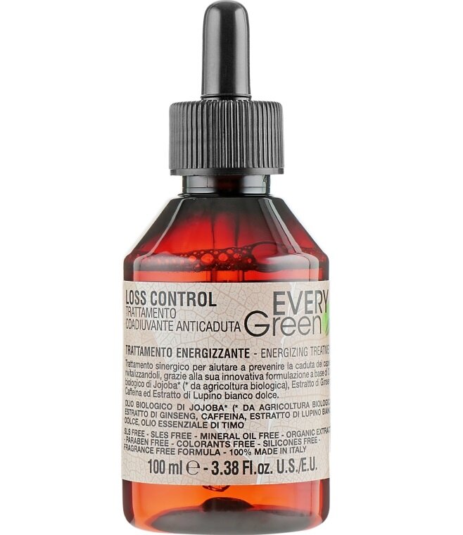 Против выпадения волос специалисты Dikson рекомендуют использовать лосьон против Every Green Loss Control Energizing Treatment. Средство на базе масла жожоба обогащено экстрактами женьшеня и белого люпина, эфирным маслом тимьяна и кофеином. Продукт с высокой концентрацией биоактивных компонентов комплексно воздействует на шевелюру. Волосы, кожные покровы и волосяные фолликулы получают необходимую влагу и питание.