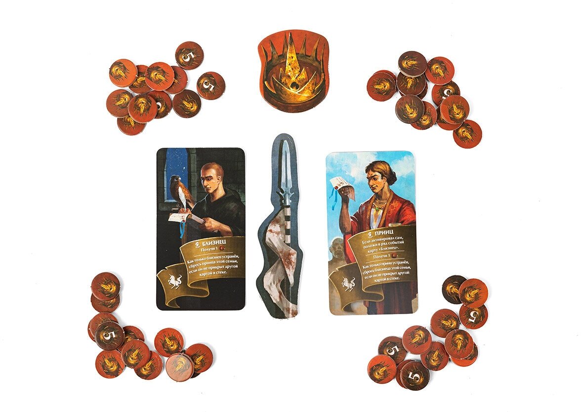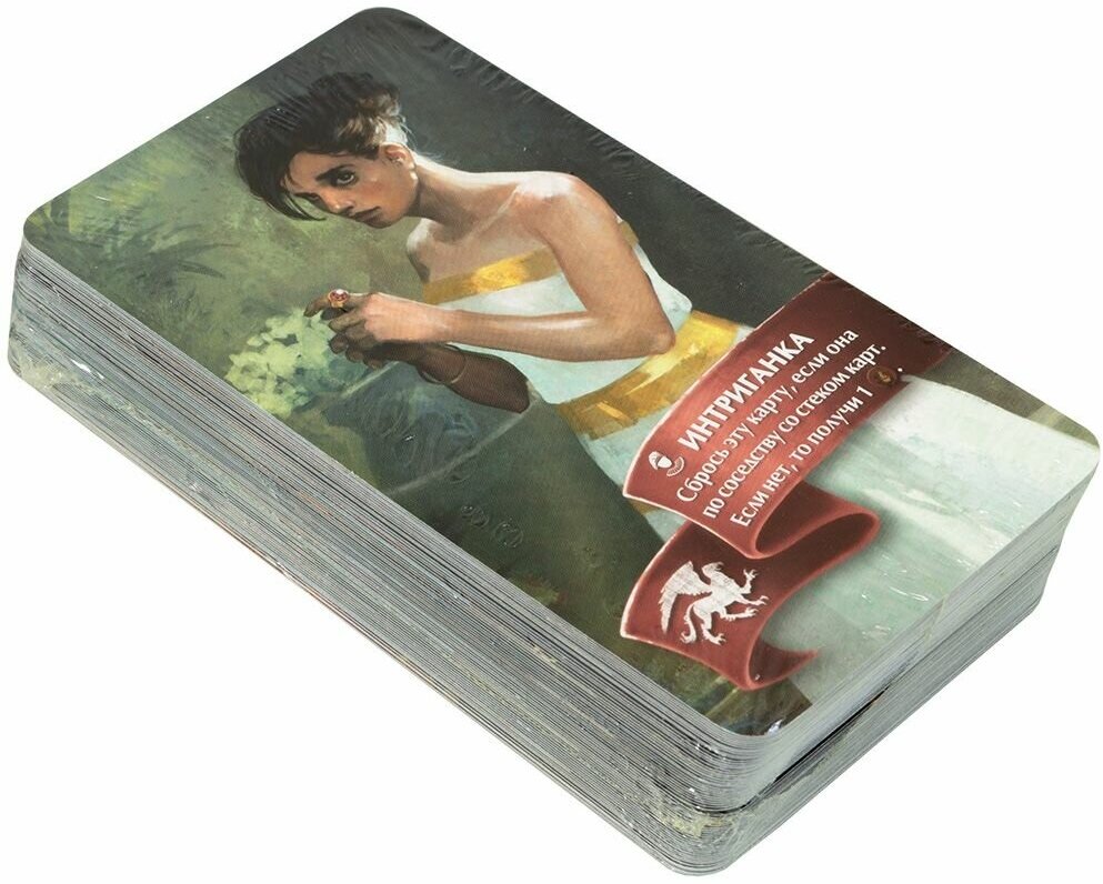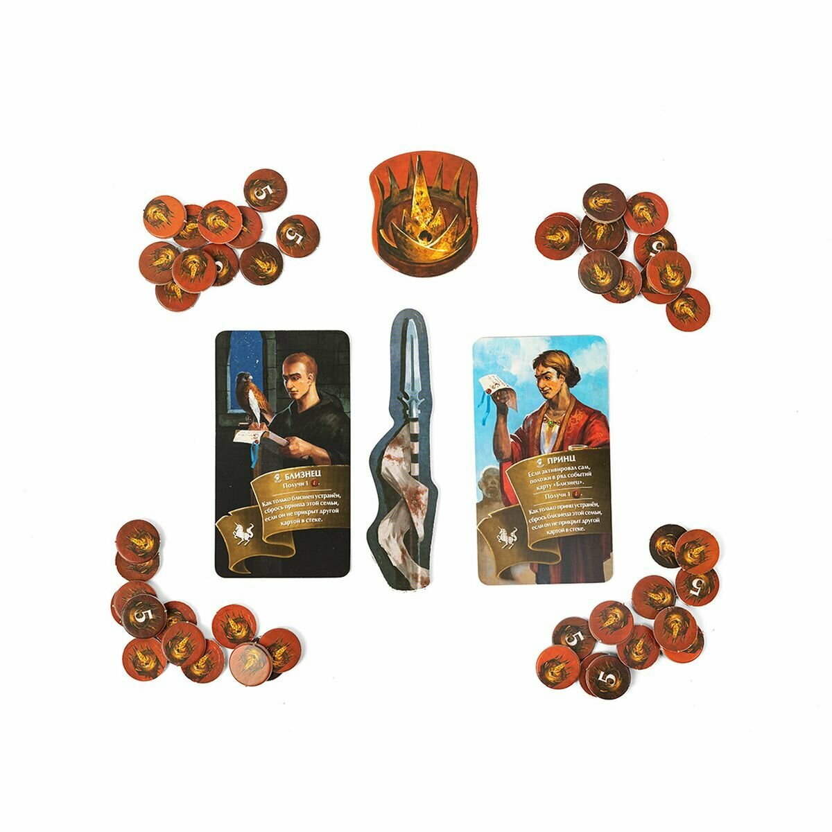 | Комплектация | 55 карт персонажей и интриг; 5 карт памяток; 63 жетонов влияния; 5 жетонов подкупа; маркер очерёдности событий; жетон первого игрока; правила игры. |