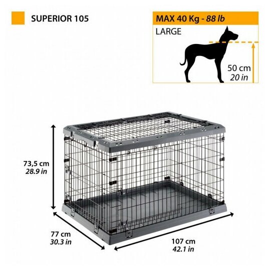 Складная клетка Superior оборудована большими дверцами и даёт возможность использовать её в различных целях как дома, так и на улице. Небольшая модель Superior 60 предоставляет возможность открытия с двух сторон, сбоку и сверху, в то время как модели большего размера можно открыть с 3-х разных сторон: сбоку, сверху и спереди. Кроме того, верхняя часть клетки открывается и снимается. Это очень удобно, поскольку позволяет беспрепятственно погладить собаку, когда вам захочется. Широкие дверки, усиленные замком с двойным предохранителем, позволяют легко добраться до вашего питомца.