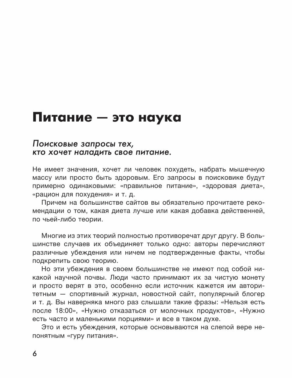 Но эти убеждения в своем большинстве не имеют под собой никакой научной почвы. Люди часто принимают их за чистую монету и просто верят в это, особенно если источник кажется им авторитетным – спортивный журнал, новостной сайт, популярный блогер и т. д. Вы наверняка много раз слышали такие фразы: «Нельзя есть после 18:00», «Нужно отказаться от молочных продуктов», «Нужно есть часто и маленькими порциями» и все в таком духе.