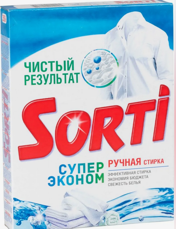 Средство моющее синтетическое порошкообразное универсальное "Sorti Супер Эконом Ручная стирка". Порошок стиральный синтетический универсальный с ненормируемым пенообразованием для замачивания и стирки изделий из хлопчатобумажных, льняных, синтетических тканей, а также тканей из смешанных волокон в стиральных машинах активаторного типа и ручной стирки, для влажной уборки помещений и мытья загрязненных поверхностей из пластика и кафеля.