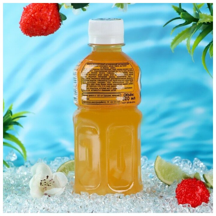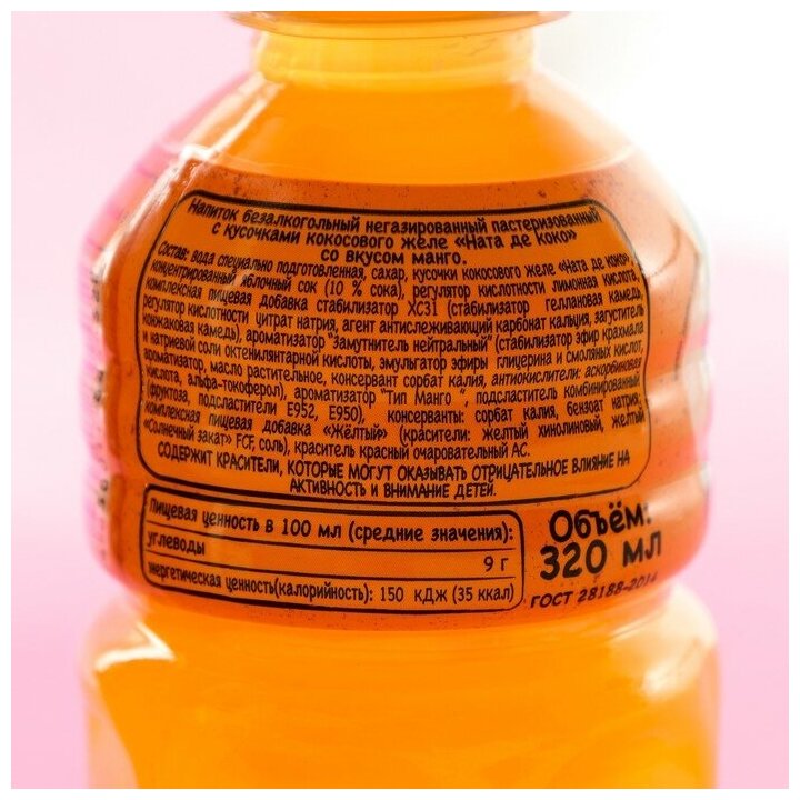 | Состав | вода специально подготовленная, сахар, кусочки кокосового желе Ната де коко, концентрированный яблочный сок (10% сока), регулятор кислотности лимонная кислота, агент желирующий геллановая камедь, регулятор кислотности цитрат натрия, агент антислеживающий карбонат кальция, загуститель конжаковая камедь, ароматизатор Манго, ароматизатор Замутнитель нейтральный (вкусоароматические препараты и натуральные вещества, стабилизатор Е1450, эмульгатор Е445, ароматизатор, масло растительное, консервант Е202, антиокислители |