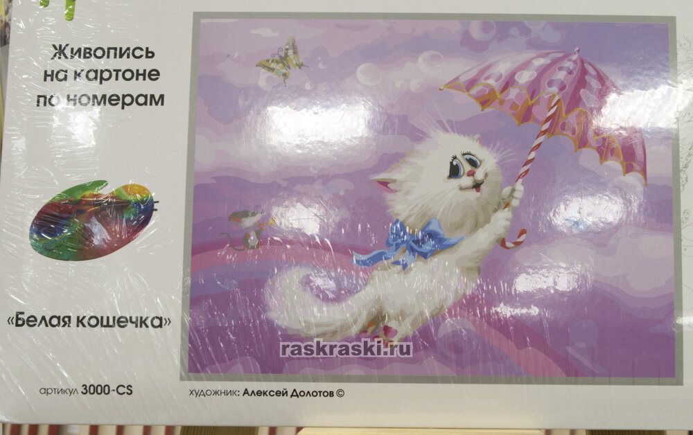 Живопись на картоне по номерам 30*40 см по сюжету картины художника Алексея Долотова. Эта милая парящая беленькая кошечка с розовым зонтиком на нежном романтичном фоне непременно скрасит ваш вечер и чудесно украсит ваш дом. В качестве основы для картины используется качественный многослойный прессованный картон с верхним белым слоем толщиной 2 мм. На картон серым цветом нанесены контуры будущей картины, внутри контуров расположены цифры, которые соответствуют номерам красок. Количество цветов в живописи: 35. Набор комплектуется акриловыми красками на водной основе, без запаха и экологически безопасными. Краски расфасованы в белые баночки с крышками, между собой баночки скреплены по 6 штук. Наклейка на крышке указывает на порядковый номер краски и соответствует нумерации на картоне. Набор красок упакован в вакуумный пакет, что исключает высыхание красок. Цветная упаковка сделана в форме конверта из плотного картона, на лицевой стороне дана большое изображение готовой работы, на обратной стороне упаковки напеча