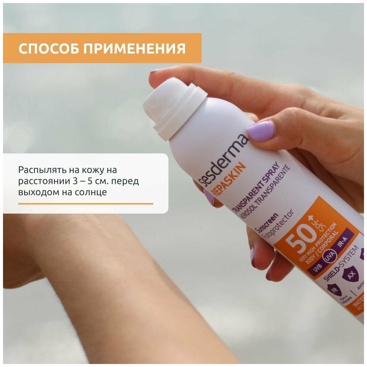 Распылять на кожу на расстоянии 3 – 5 см. перед выходом на солнце.