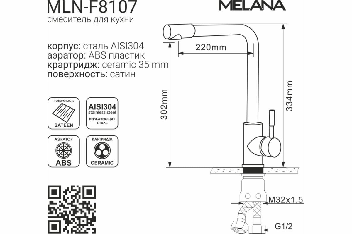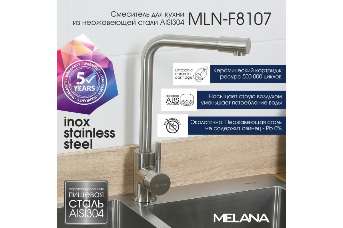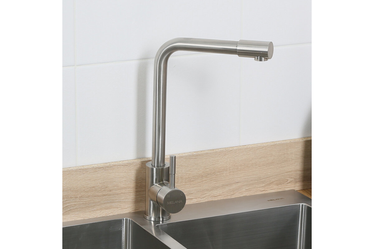 Один из самых востребованных кухонных смесителей Melana. Высокий смеситель "Г"-образной формы обеспечивает максимальное пространство и удобство для мытья посуды. Большие тарелки или сковороды не будут задевать смеситель, удобно будет ставить большуюкастрюлю. Даже с неглубокой мойкой мытье посуды с высоким смесителей будет комфортным. Материал: нержавеющая сталь AISI 304. - устойчив к коррозии, - сохраняет сияние, - безопасный, - экономичный, - долговечный, - термоустойчивый (до 90С). Гарантия на коррозийную стойкость изделия - 5 лет со дня продажи. Гарантия на картридж, аэратор, шланги гибкой подводки, резиновые прокладки - 1 год со дня продажи.