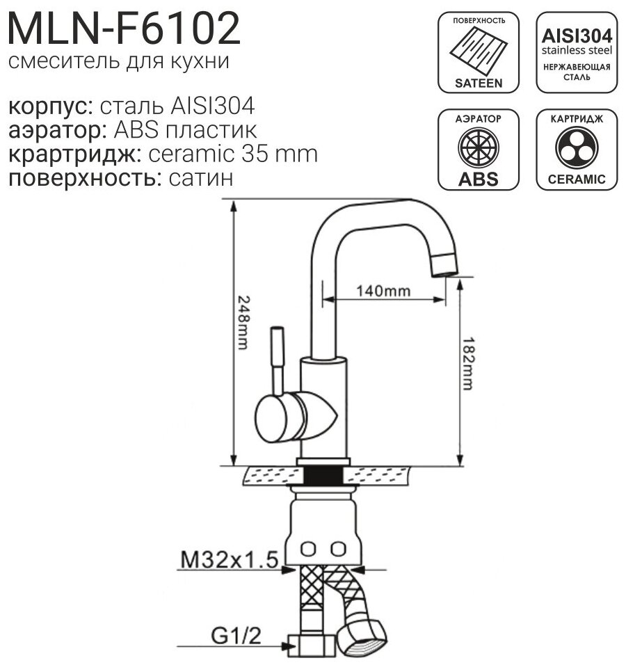 Классический смеситель для кухни. Практичный и долговечный. Может стать прекрасным решением не только для городской кухни, но и для дачи. Он выполнен из нержавеющей стали, устойчивой к коррозии. Поэтому его можно использовать даже на открытой летнейкухне. В смесителе установлен аэратор из высокопрочного ABS-пластика, который наполняет струю воды воздухом и снижает ее расход. Керамический картридж с ультразвуковой полировкой рассчитан на 500 000 циклов и обеспечивает длительный срок службы. Гарантия на коррозийную стойкость изделия - 5 лет со дня продажи. Гарантия на картридж, аэратор, шланги гибкой подводки, резиновые прокладки - 1 год со дня продажи.