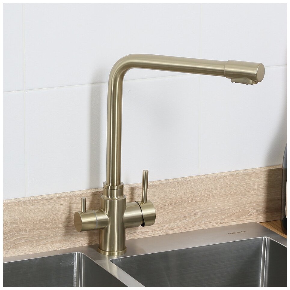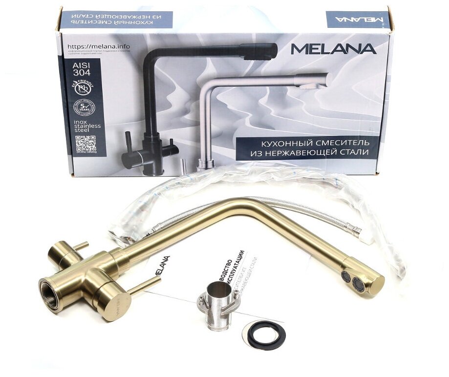 Стильный и современный кухонный смеситель Melana обладает рядом преимуществ. Золотой оттенок сделает смеситель центральным элементом и украшением любого кухонного интерьера. В смесителе предусмотрено подключение к фильтру, что очень удобно: не нужноприобретать кран для фильтрованной воды. Помимо внешних достоинств смеситель экономичен и долговечен. Он выполнен из нержавеющей стали, которая по устойчивости к коррозии и надежности не уступает латуни, но выигрывает по цене. Кроме того, в нем установлен аэратор из высокопрочного ABS-пластика, который наполняет струю воды воздухом и снижает ее расход. Керамический картридж с ультразвуковой полировкой, рассчитанный на 500 000 циклов обеспечивает длительный срок службы. Гарантия на коррозийную стойкость изделия - 5 лет со дня продажи. Гарантия