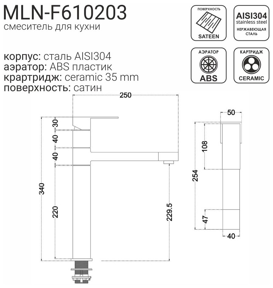 Современный кухонный смеситель с высоким изливом выполнен из премиальной марки нержавеющей стали, обладающей повышенной устойчивостью к коррозии. Верхняя часть смесителя и аэратор поворачиваются, что позволяет точнее направлять поток воды, а не подстраиваться под него. Высота смесителя делает мытье больших кастрюль удобнее и без проблем позволяет набрать воду в высокую вазу. Помимо функциональных преимуществ смеситель имеет стильный дизайн. Он прекрасно подойдет для современной кухни в стиле хай-тек. Кроме того, он долговечен и экономичен. Гарантия на коррозийную стойкость изделия - 5 лет со дня продажи. Гарантия на картридж, аэратор, шланги гибкой подводки, резиновые прокладки - 1 год со дня продажи.