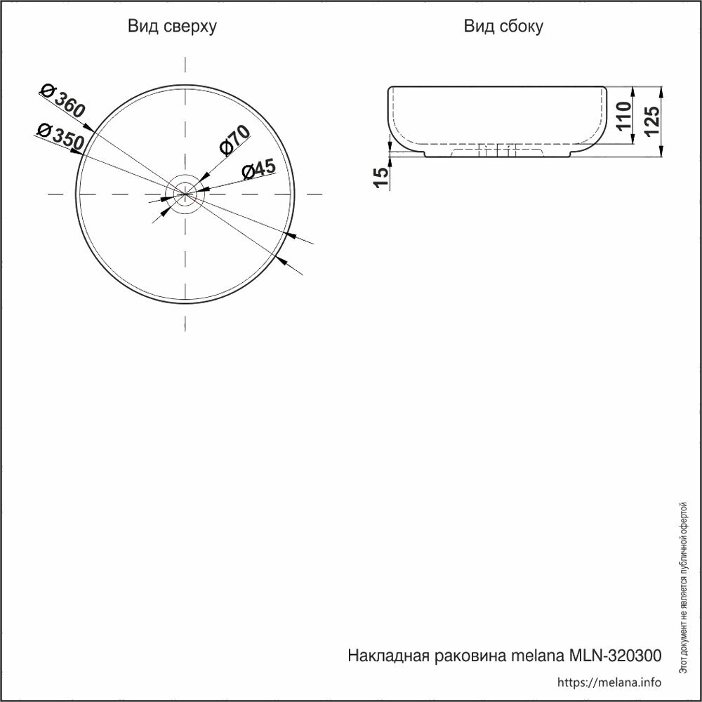 Ширина: 360. Глубина: 360. Высота: 125. Форма круглая. Отверстие под перелив: без перелива. Отверстие под смеситель: нет. Тип раковины: накладная. Цвет: белый