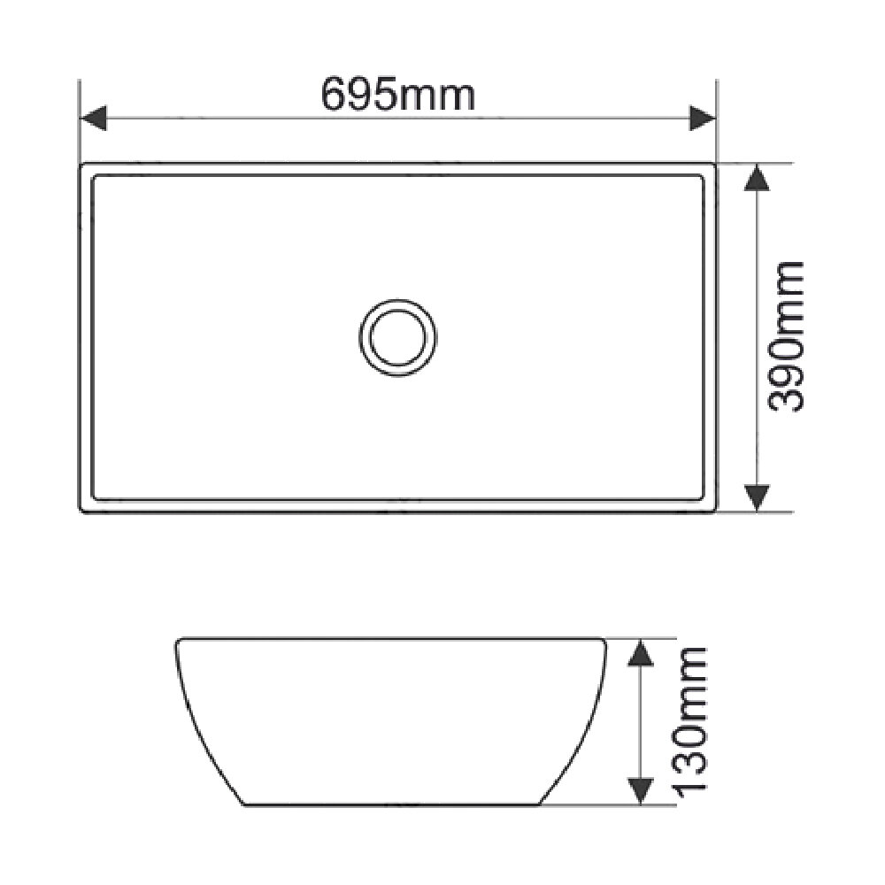 Ширина: 695. Глубина: 390. Высота: 130. Форма прямоугольная. Отверстие под перелив: без перелива. Отверстие под смеситель: нет. Тип раковины: накладная. Цвет: белый
