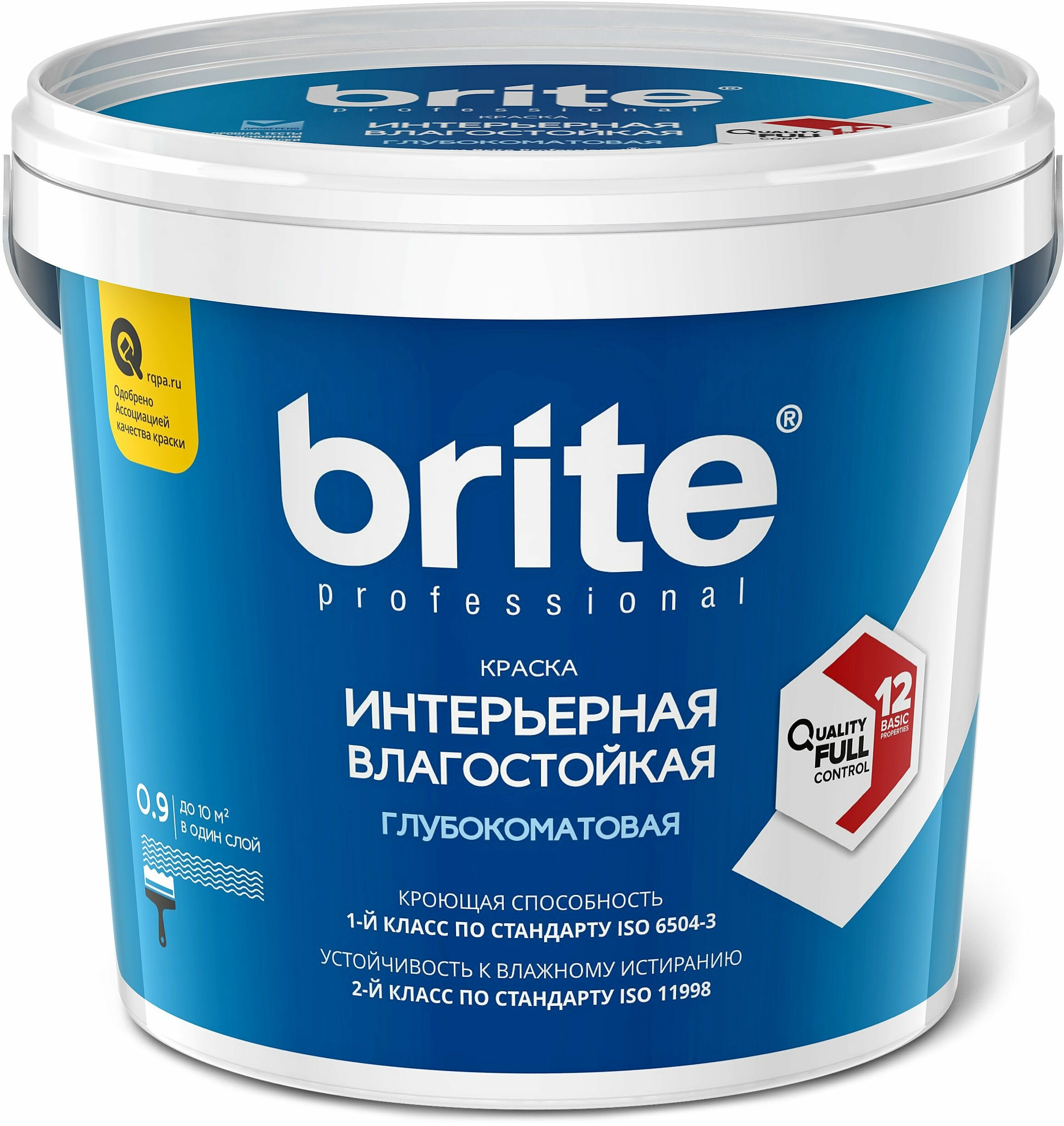 Профессиональная акриловая краска Brite Professional Quality Full Control интерьерная влагостойкая глубокоматовая. Рекомендована для отделки стен и потолков в помещениях, требующих влажной уборки с применением растворов синтетических моющих средств. Образует бархатистое покрытие, которое соответствует 1-му классу стойкости к влажному истиранию по стандарту ISO 11998.Соответствует 1-му классу стойкости к влажному истиранию;1-й класс по кроющей способности;Обладает хорошей укрывистостью в мокром и сухом слое;Подходит для обоев под окраску;Без запаха.Экологически безопасна. Рекомендована для окраски помещений в лечебно-профилактических, учебных и детских учреждениях.