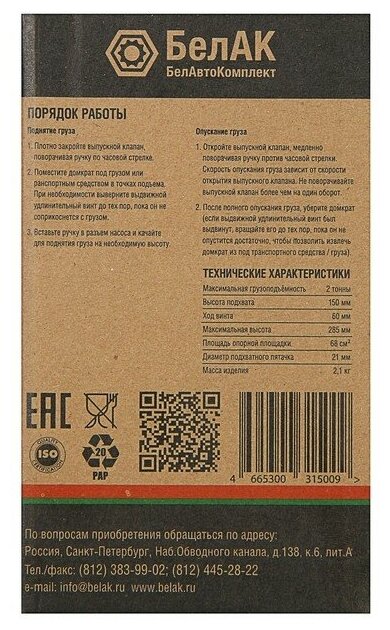 Новый товар из уникальной линейки экономичных и экологичных домкратов, произведенных из вторично переработанных продуктов металлообработки без потери качества. Как производитель, «БелАК» сокращает объем отходов, экономит природные ресурсы, развивает культуру осознанного потребления с соблюдением баланса цены и качества. Домкраты «ЭКО» - оптимизация расходов, сохранение окружающей среды и безопасность в использовании. Максимальная высота: 278 мм Ход винта: 50 мм Высота подхвата: 148 мм Длина опорной площадки: 75 мм Ширина опорной площадки: 90 мм Диаметр подхватного пятачка: 21 мм Масса изделия: 1,9 кг