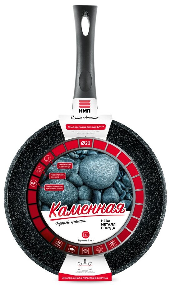 Литая сковорода серии «Литая», линии «Каменная» Черный гранит НМП предназначена для ежедневного использования. Диаметр сковороды 22 см. Толщина дна 4 мм, толщина борта 2,8 мм. Высота борта 5,3 см. Толстостенный литой корпус. Сковорода «Каменная» с антипригарным покрытием не содержит пфоа, обладает хорошими антипригарными свойствами. Подходит для газовых, электрических и стеклокерамических плит. 2 года гарантии от производителя. Можно мыть в посудомоечной машине