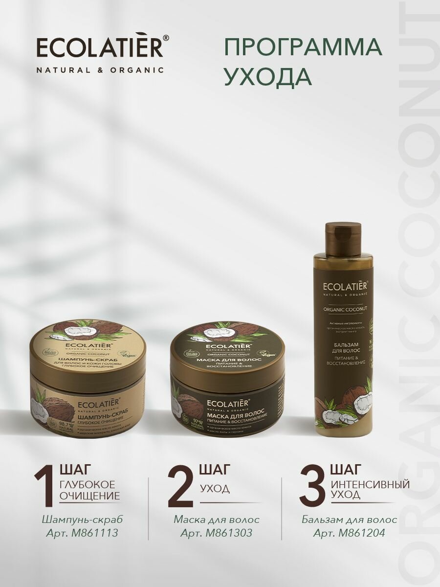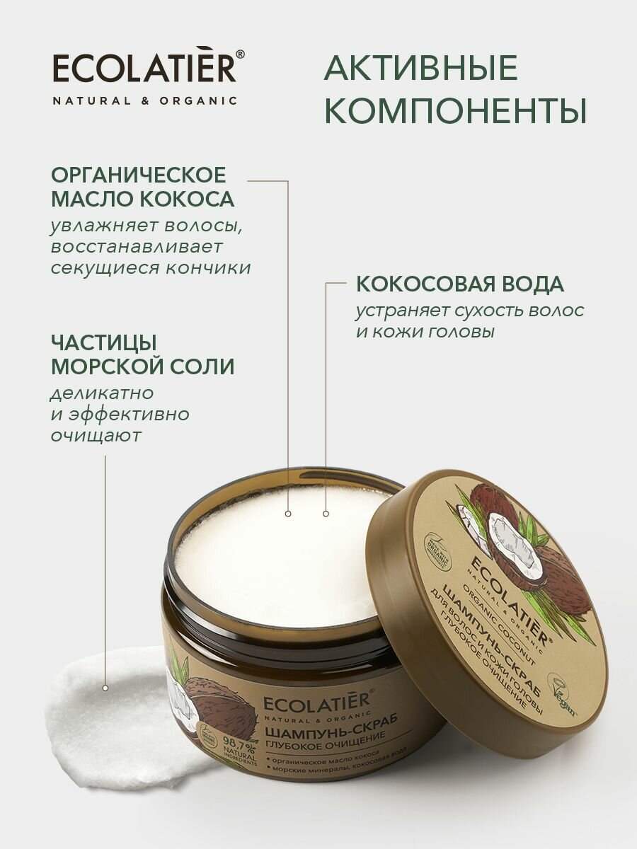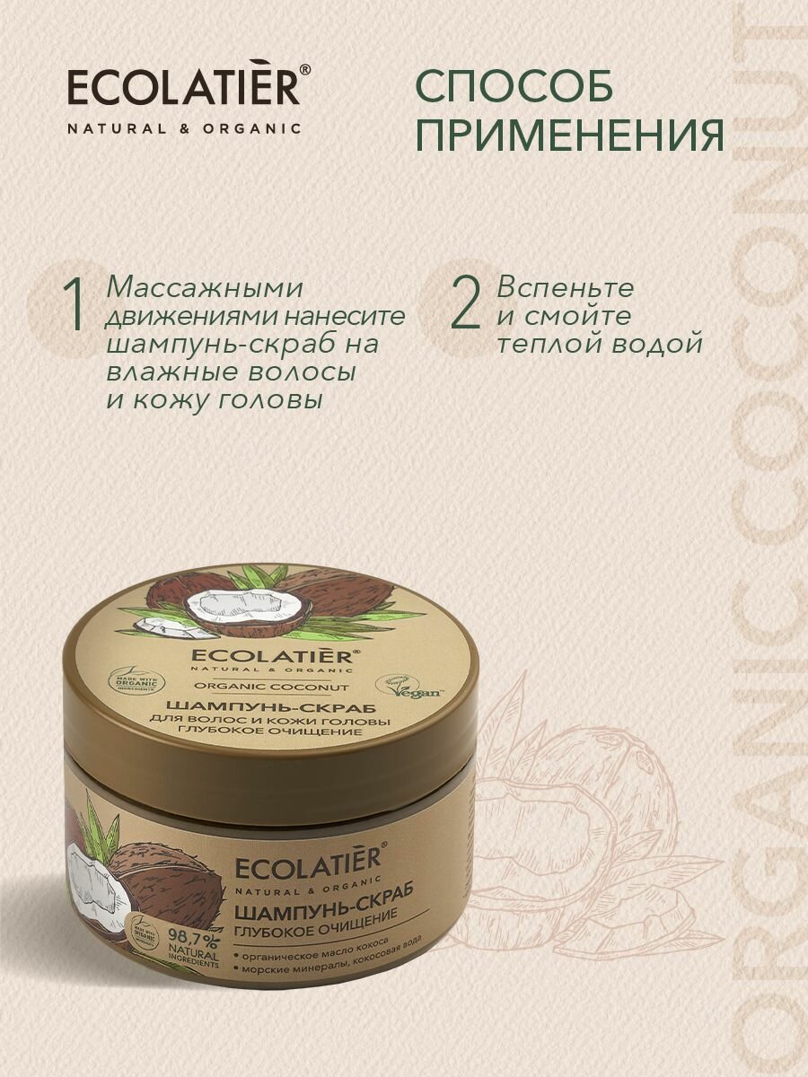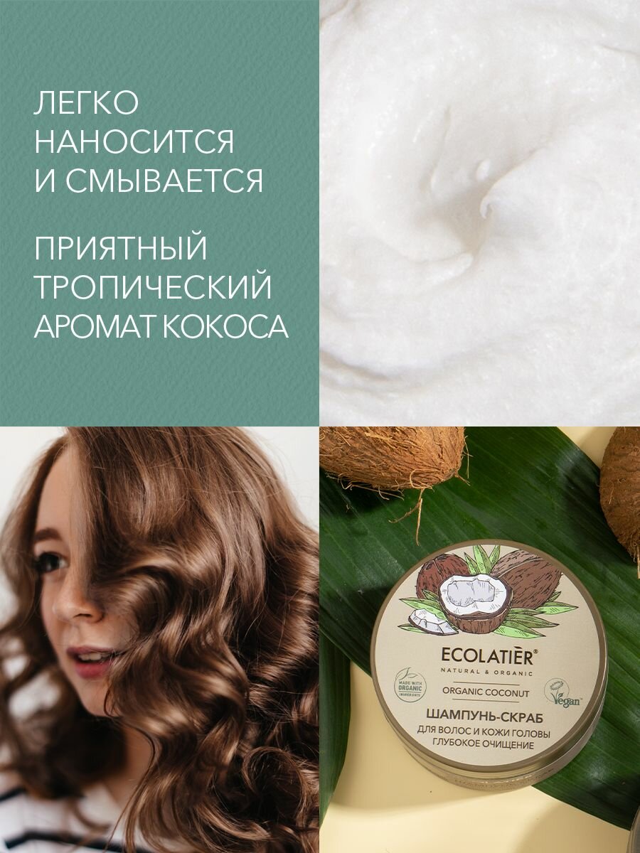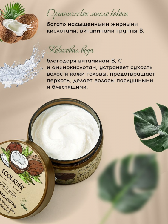 Шампунь - скраб ECOLATIER Organic Coconut, благодаря натуральным активным компонентам в составе, делает процедуру очищения кожи головы и волос нежной и приятной. Специальные скрабирующие микрочастицы кокоса обеспечивают массаж и глубокое очищение кожи от лишнего себума и средств для укладки, активизируют кровообращение и клеточное дыхание кожи. Соответствует требованиям Vegan Society (Великобритания). Продукт содержит более 97% ингредиентов растительного происхождения. Органические ингредиенты: Органическое масло кокоса богато насыщенными жирными кислотами, витаминами группы В. Эффективно увлажняет волосы, восстанавливает секущиеся кончики, защищает от негативных воздействий окружающей среды. Минералы морской соли деликатно обновляют кожу, не нарушая естественного липидного барьера, придавая ей свежий и ухоженный вид. Кокосовая вода, благодаря витаминам В, C и аминокислотам, устраняет сухость волос и кожи головы, предотвращает перхоть, делает волосы послушными и блестящими.