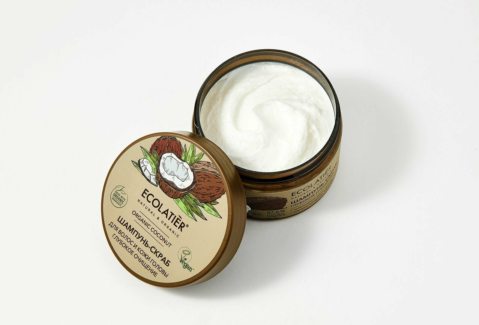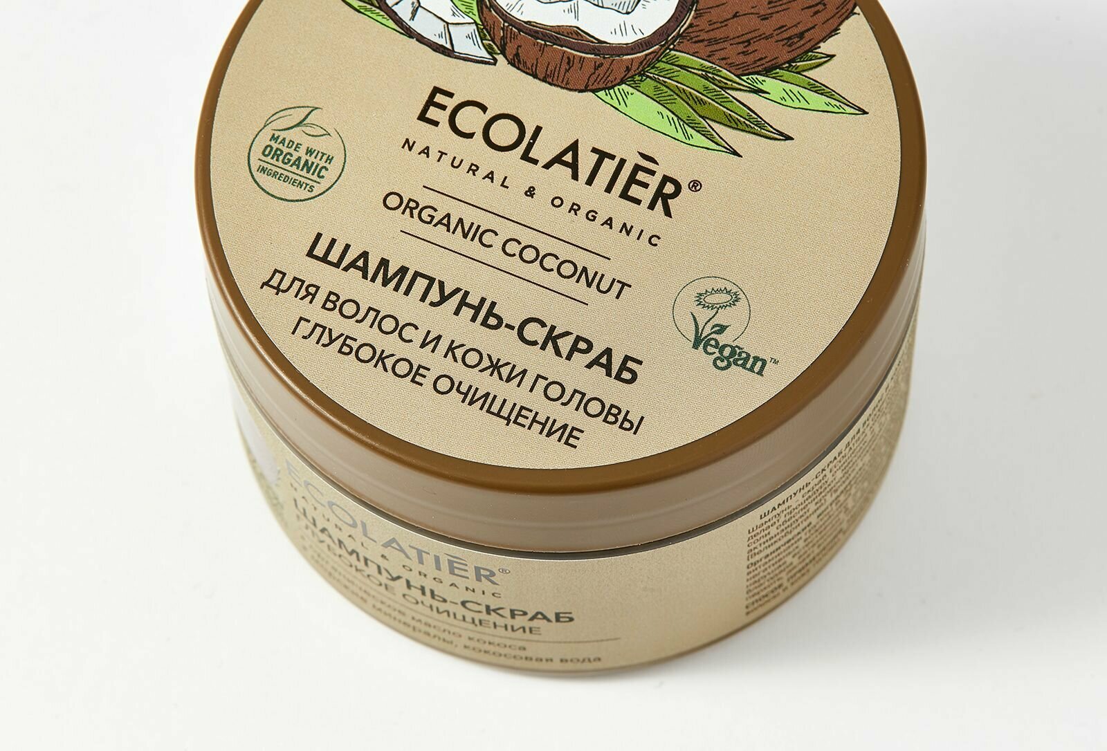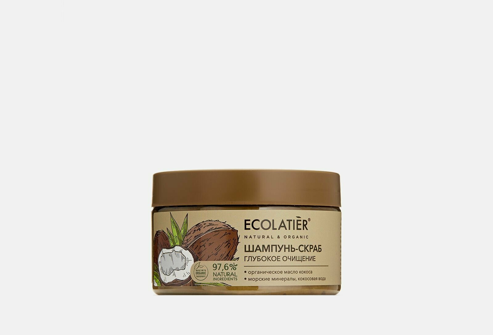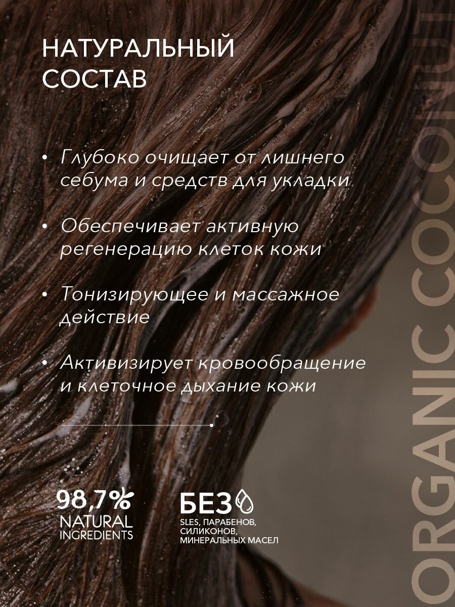 Шампунь - скраб ECOLATIER Organic Coconut, благодаря натуральным активным компонентам в составе, делает процедуру очищения кожи головы и волос нежной и приятной. Специальные скрабирующие микрочастицы кокоса обеспечивают массаж и глубокое очищение кожи от лишнего себума и средств для укладки, активизируют кровообращение и клеточное дыхание кожи. Соответствует требованиям Vegan Society (Великобритания). Продукт содержит более 97% ингредиентов растительного происхождения. Органические ингредиенты: Органическое масло кокоса богато насыщенными жирными кислотами, витаминами группы В. Эффективно увлажняет волосы, восстанавливает секущиеся кончики, защищает от негативных воздействий окружающей среды. Минералы морской соли деликатно обновляют кожу, не нарушая естественного липидного барьера, придавая ей свежий и ухоженный вид. Кокосовая вода, благодаря витаминам В, C и аминокислотам, устраняет сухость волос и кожи головы, предотвращает перхоть, делает волосы послушными и блестящими.